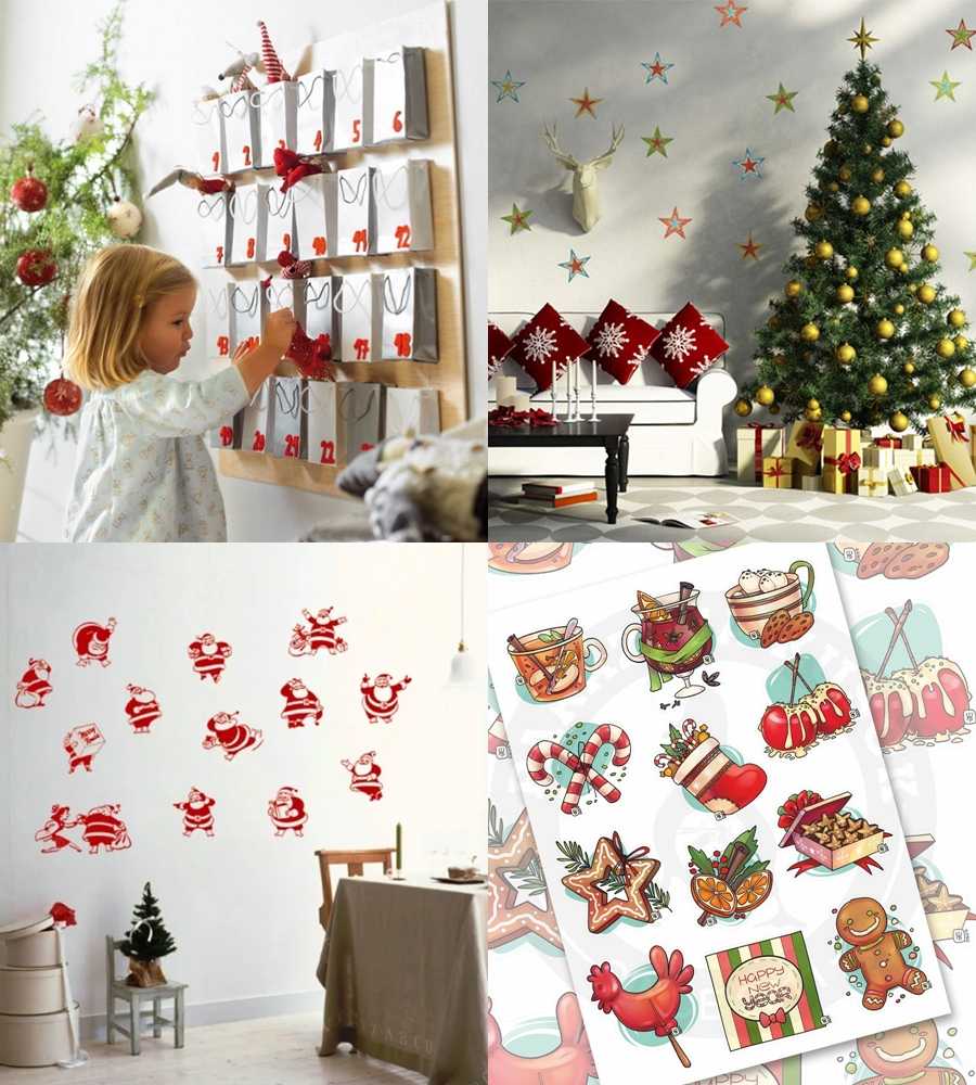 Красиво смотрятся на стенах тематические панно, рождественские сапоги, праздничные календари, гирлянды из конфет и шоколада, шары и фонарики, адвент-календари и декоративные елки. Из частей фанеры можно вырезать фигурки звездочек, елок и снежинок, раскрасив их акрилом или гуашью.