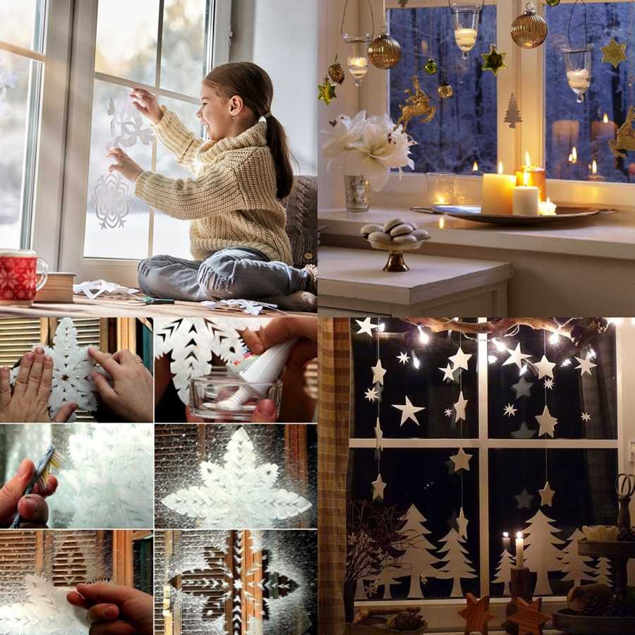 На стеклах красиво смотрятся светящиеся в темноте наклейки, новогодние сюжеты из бумажных фигурок, например, запряженных в сани оленей. Можно нарисовать акриловыми красками заснеженные домики, ангелочков, снежинки и интересные узоры, а можно с помощью трафаретов, искусственного снега или зубной пасты изобразить морозные узоры.