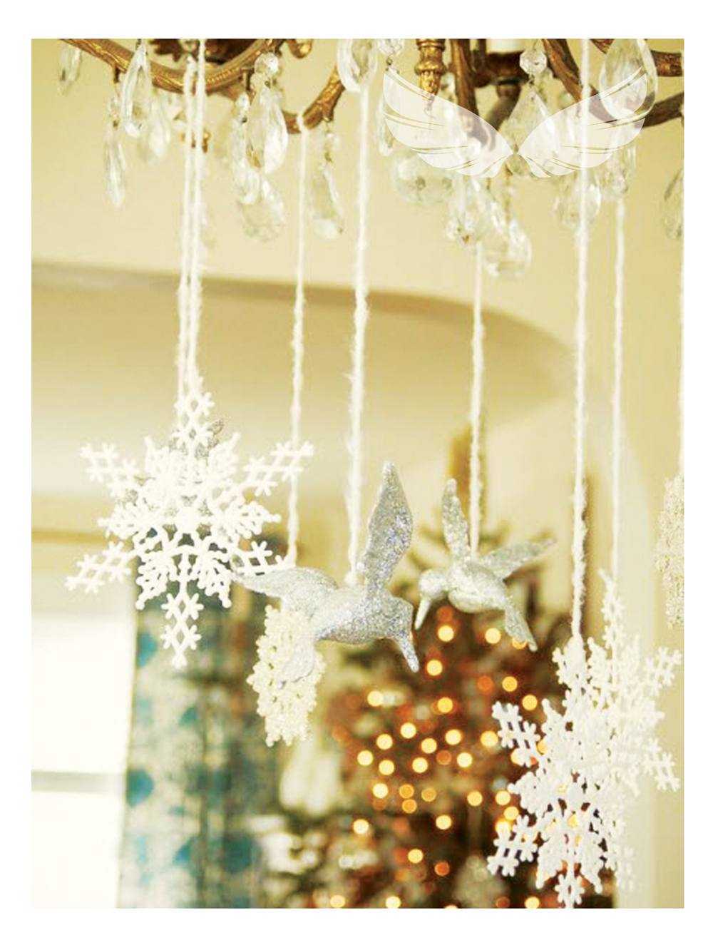 Мне очень нравится такое оформление, где красивые снежинки спускаются как будто с неба. А когда горит свет, и снежинки медленно кружатся в потоке света, можно долго смотреть на их кружение. Это очень красиво, и вместе с тем не броско.