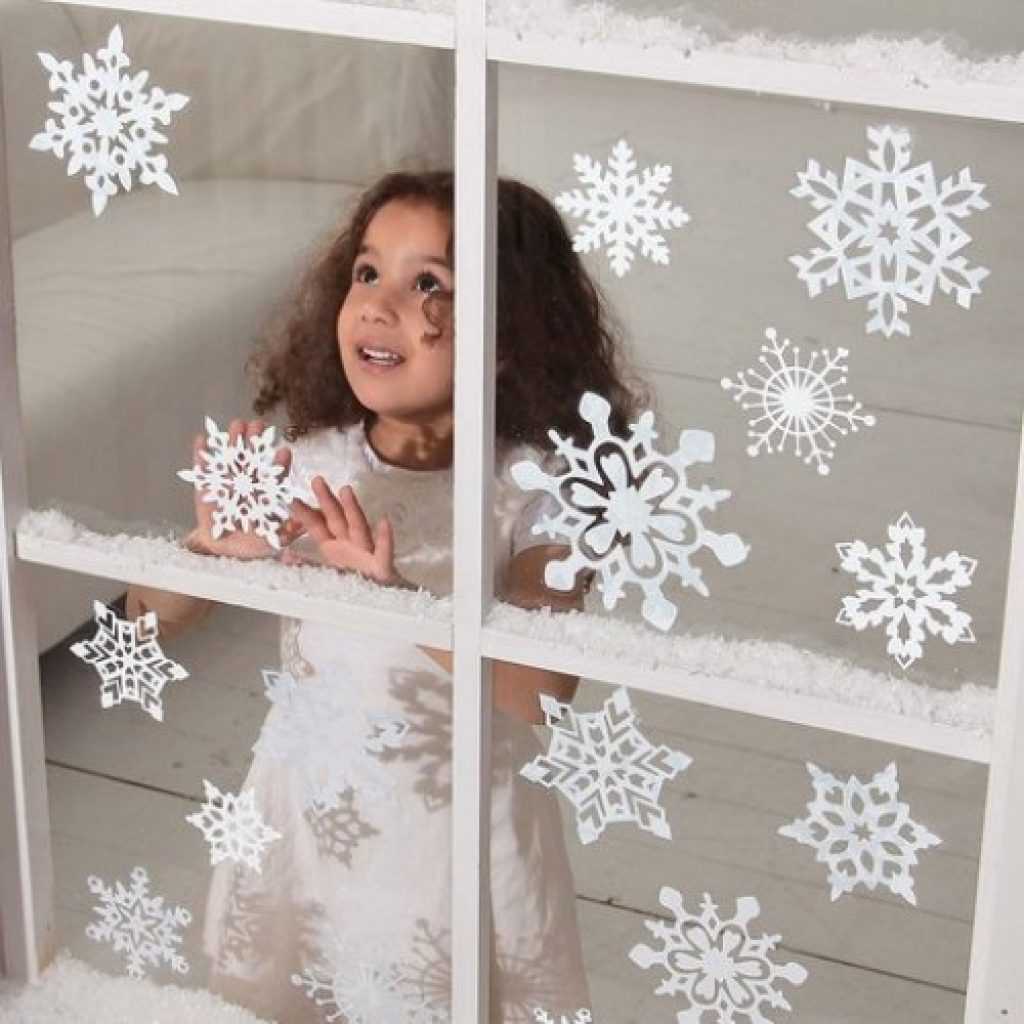 Берем ножницы, бумагу новогодних оттенков и вспоминаем детство. Лучше если снежинки будут разных размеров и цветов. Детям такая идея очень понравится.