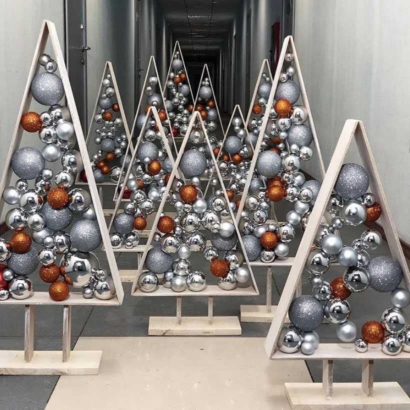 Такой вариант подходит для небольших деревьев с редкими ветками, где нужно заполнить больше пустых пространств. Для хаотичного расположения прекрасно подходит декор в разных цветах.