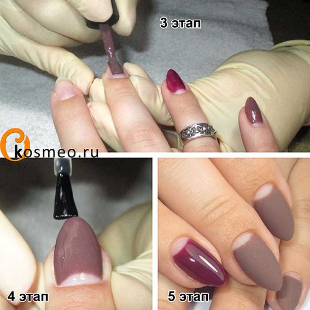 Обратите внимание! В последние годы производители выпустили немало гель-лаков и топов, которые полимеризуются без УФ-излучения, что значительно упрощает процесс создания маникюра. Матовый маникюр пошагово: