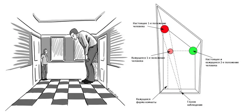 Например, комната Эймса легко обманывает умный опытный мозг. Это комната с непрямыми углами, где соотношения сторон и углов тщательно подобраны, а заглянуть внутрь можно через единственное окно. Только отсюда помещение с непрямыми углами выглядит так, как обычная прямоугольная комната. Мозг, как всегда, ставит на статистику и проигрывает, но в реальном мире эта ставка обычно срабатывает: прямоугольных комнат в миллионы раз больше, чем комнат Эймса.