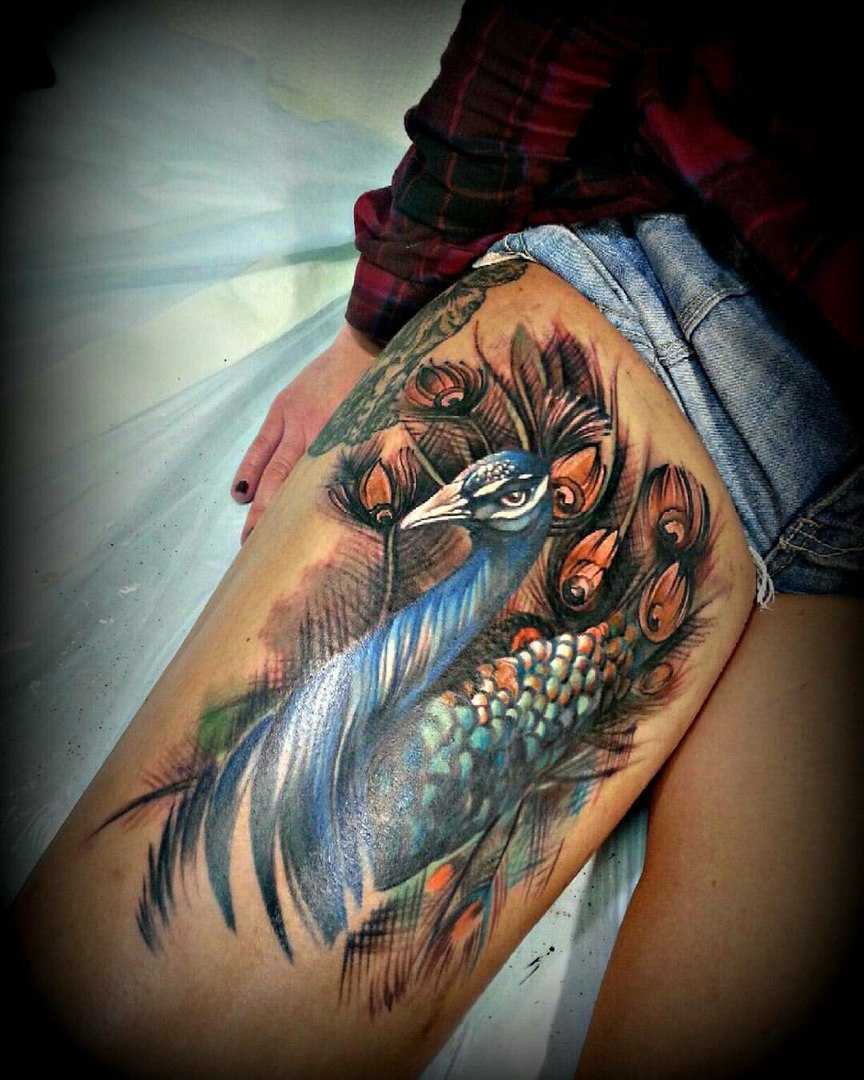 В культуре нательной живописи особое место занимают татуировки павлин и перо павлина. Об этих птицах нет смысла говорить долго, поскольку их необычный внешний вид гораздо интереснее любых скрытых смыслов и ассоциаций. Безусловным объектом восхищения любителей тату является невероятный красоты хвост, который своими размерами превосходит размер самой птицы. Такая татуировка на теле девушки заметно выделит ее на фоне окружающих, придаст дополнительную грацию и изысканность. Но всё же поговорим о смыслах, которые может содержать такая картина.