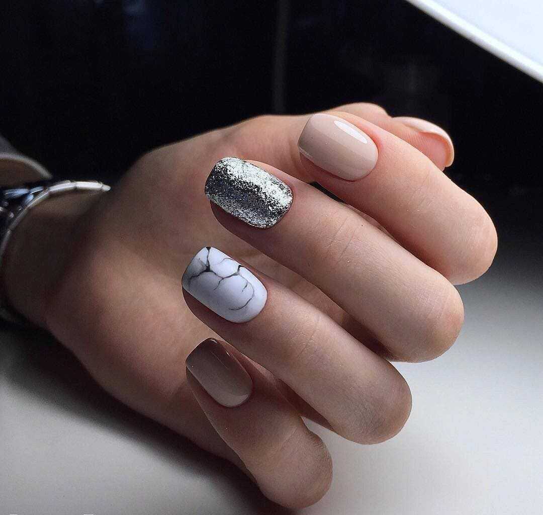 Мраморный дизайн завоевал сердца многих девушек. Имитация мрамора придаёт маникюру законченность и креативность. Выполните классический белый маникюр в технике мрамор, чёрный с белыми прожилками, а также доступен любой другой вариант в разных оттенках палитры. Чтобы дополнить его используйте золотую, серебряную или разноцветную фольгу, блестящий лак и небольшое количество страз.