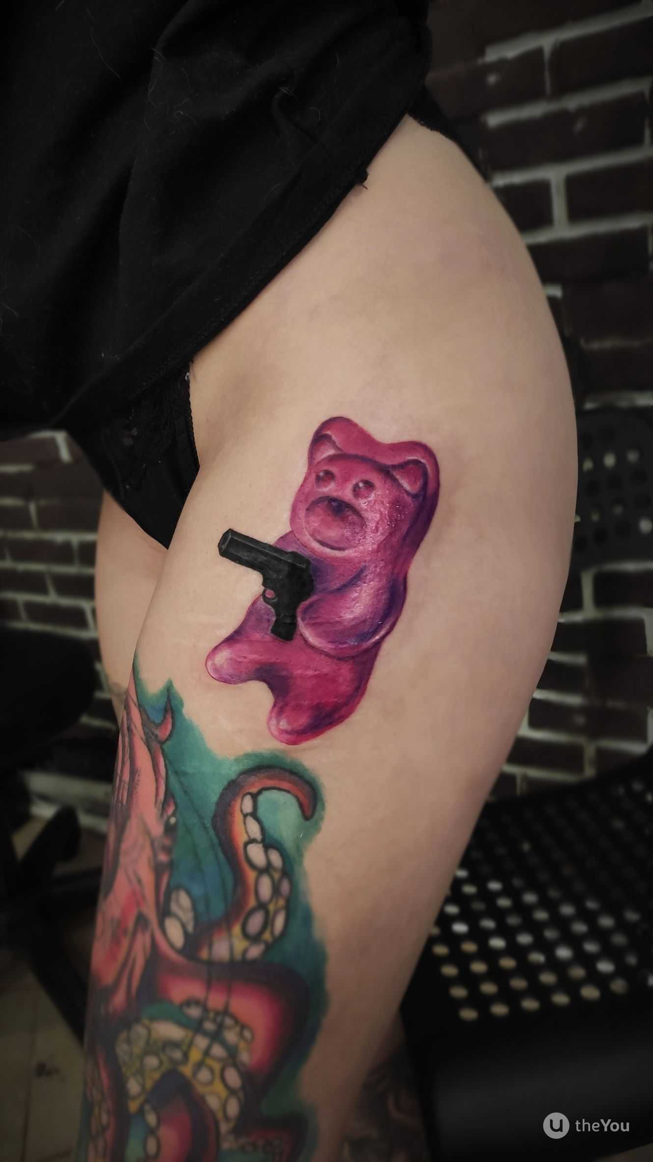 Многие выбирают именно бедро для нанесения тату, так как считается, что именно эта область менее болезненная. Отчасти это действительно так, но если рисунок будет большим, то будьте готовы к длительным болевым ощущениям. Также во время процедуры может появляться небольшое количество крови, что тоже малоприятно.
