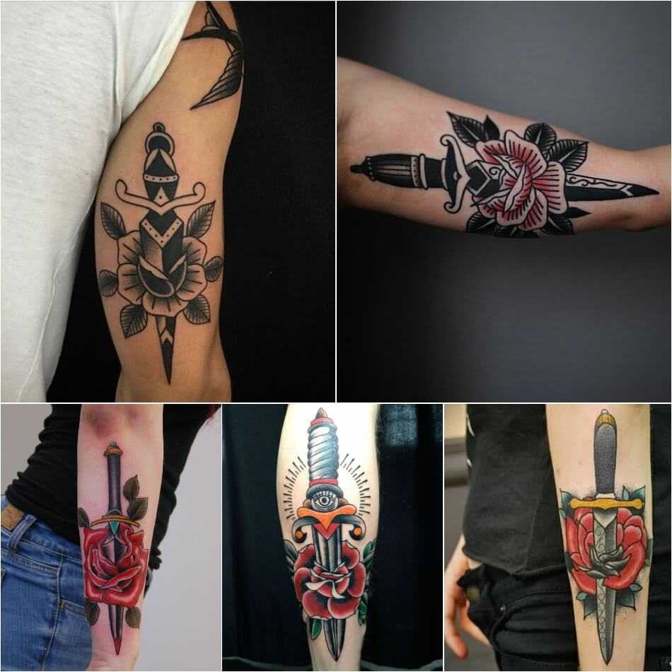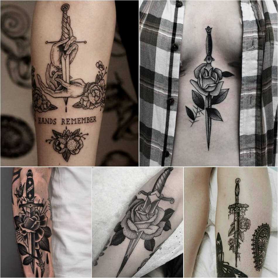 Тату роза и кинжал можно трактовать как сложные или даже двойственные чувства. Отношения на грани любви и ненависти.
