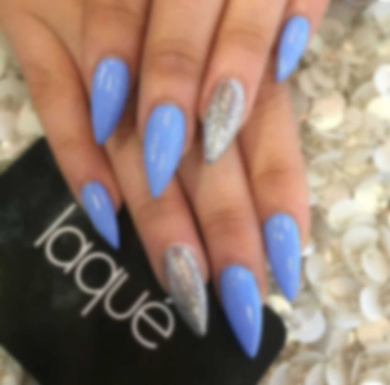 Среди обладательниц нарощенных ногтей популярностью пользуются блестящие дизайны. Для их создания может использоваться переводная фольга, стразы, блестки, камни, камифибуки, глиттер.