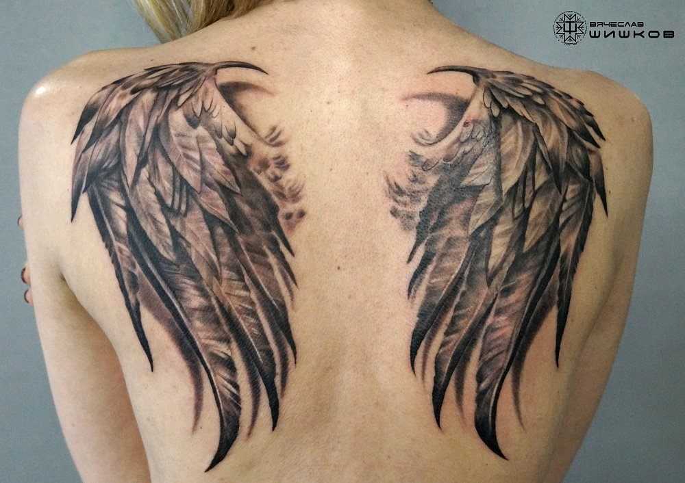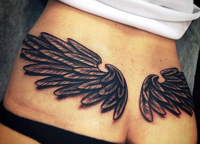 Изображение ангельских крыльев не всегда связано с религией, ведь каждый из нас одновременно не может быть человеком и принадлежать к свите ангелов. В большинстве примеров, крылья ангела наносят на теле в память о близком человеке, который покинул мир живых. Помимо этого, такой эскиз указывает на стремление вознестись нам мирскими заботами и суетой. Рисунок с ангельскими крыльями на женском теле указывает на её красоту, непорочность и чистоту помыслов. Подобное изображение на мужском теле говорит о доброте души своего хозяина. Не редко такой вид крыльев дополняется в татуировке нимбом, надписями с именами или инициалами, сердцем или цветами.