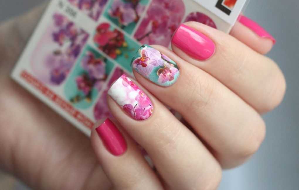 Маникюр с цветами, фруктами и ягодами – дизайн на лето 2018, который можно осуществить, как с помощью умелых рук нейл-мастеров, так и с помощью наклеек-слайдеров.