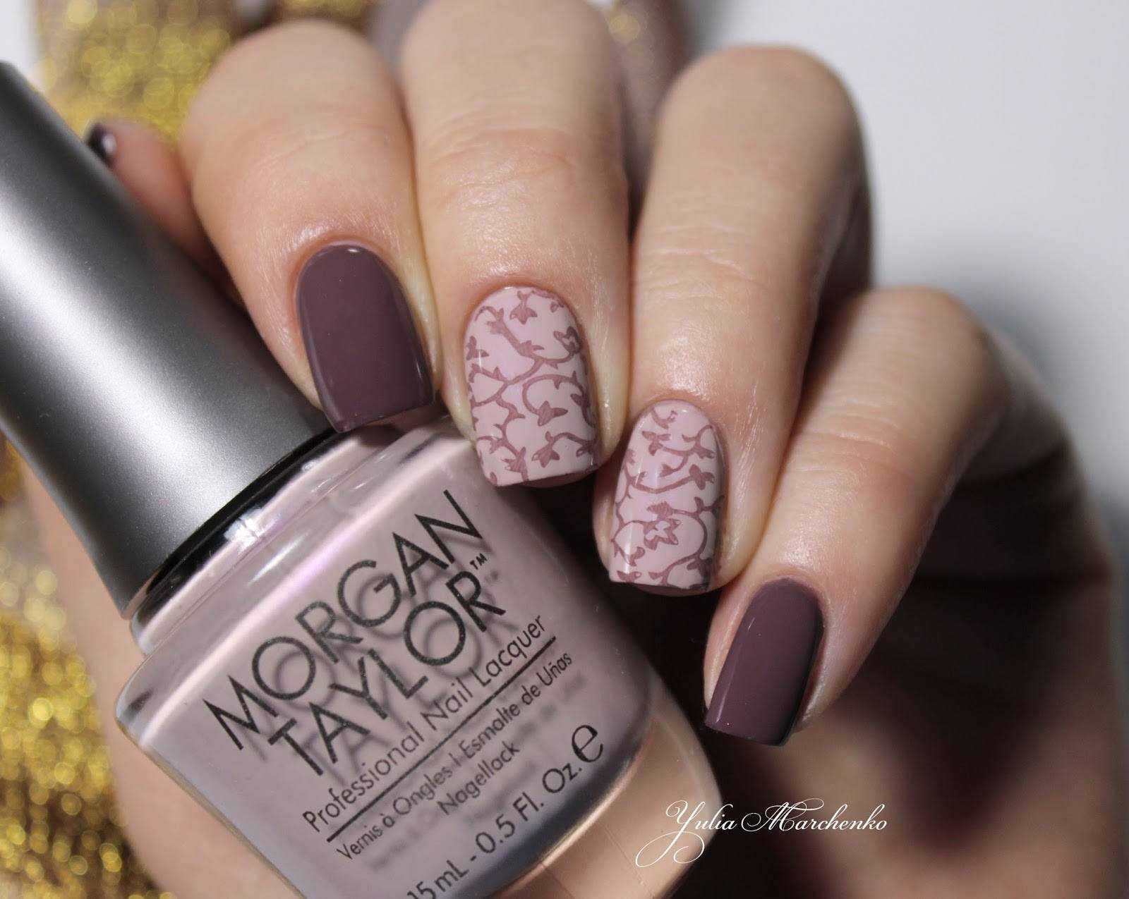 Дополнить оттеночную гамму можно как декорацией, так и орнаментом или рисунком. Чтобы выглядеть актуально, достаточно нарисовать полосы, расположенные хаотично. А также можно нанести на матовую лаковую поверхность глянцевый рисунок в виде спирали, капель или усложненный геометрический орнамент.