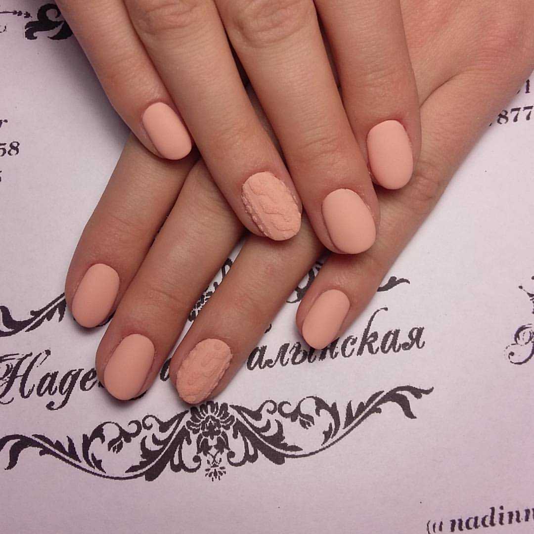 Матовый маникюр, как и битое стекло перекочевал из прошлого сезона в этот. В прошлом он был на пике моды и многим модницам совсем не хочется с ним расставаться. Матовую поверхность можно создавать двумя способами – цветным матовым лаком или покрыть пластину специальным закрепителем, он тоже дает матовую поверхность после высыхания. Модными матовыми оттенками в этом сезоне считаются: темный синий, бордовый, мятный, кофейный, черный. На пике моды будет дизайн с сочетанием матового покрытия с глянцевым на одном пальце.