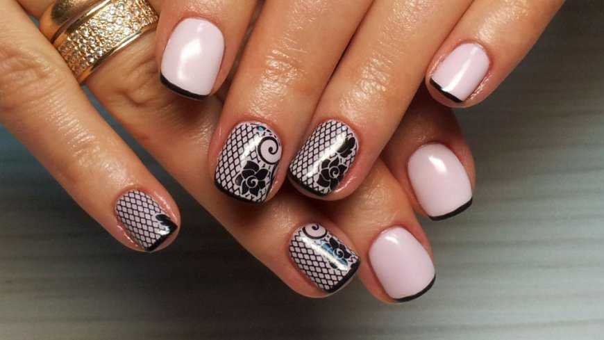 С нежной матовой отделкой прекрасно сочетаются сетчатая черная вуаль или ажурное кружево. Нейл-мастера рекомендуют отдавать предпочтение светлым пудровым тонам: телесному, молочному, розовому. Для создания эксклюзивного узора можно использовать кусочки кружевной ткани в объемном исполнении, готовые трафареты или наклейки для начинающих.
