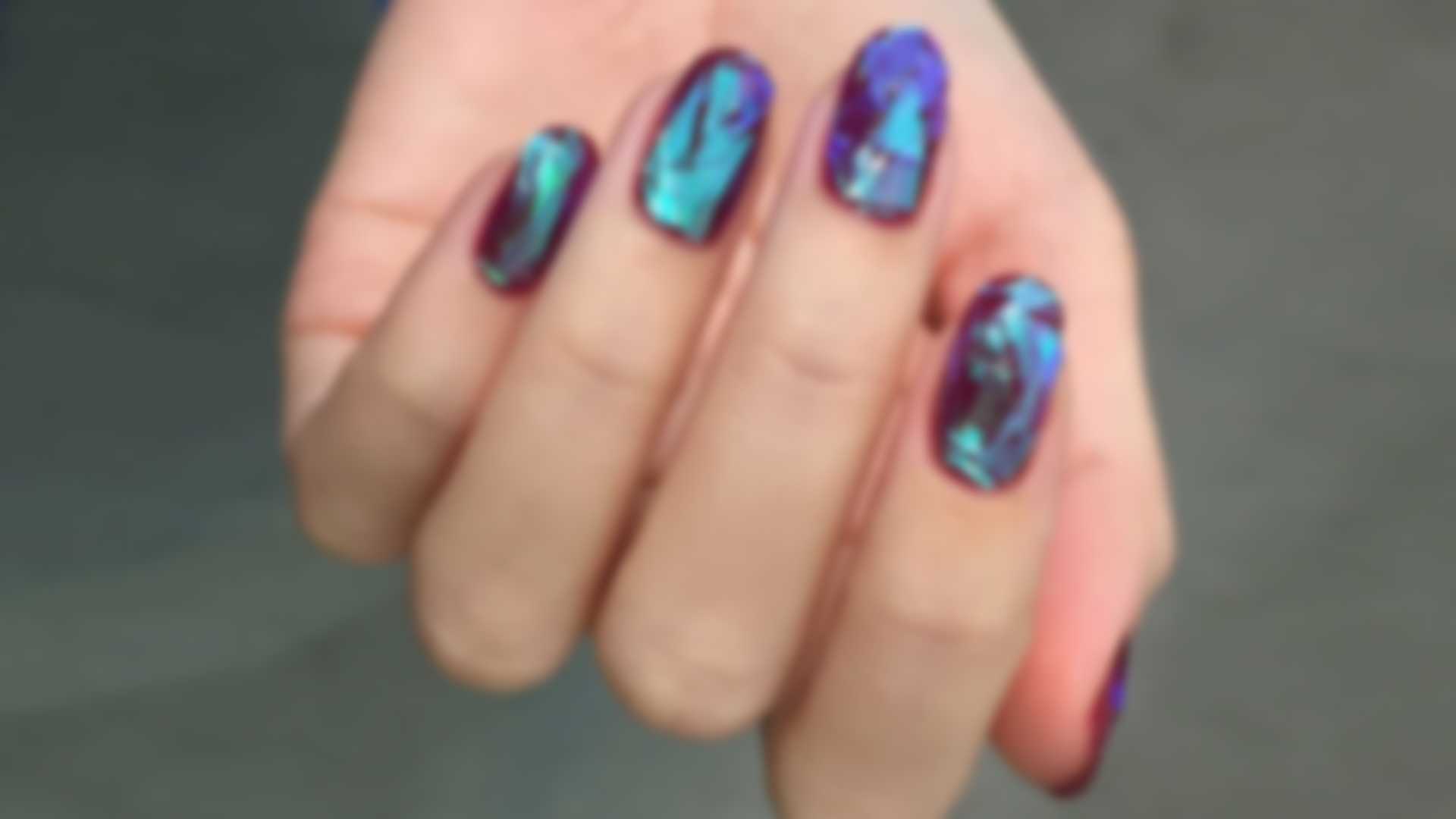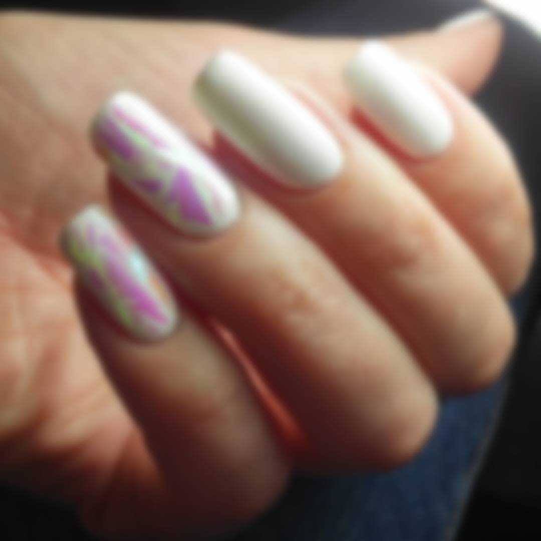 Этот непростой дизайн также можно отнести к одному из самых трендовых в этом сезоне. Практически все модные показы в нейл-индустрии используют эффект битого стекла. При попадании солнечных лучей голографические частички покрытия начинают переливаться необычным блеском. Благодаря этому декор прекрасно смотрится как в дневное, так и вечернее время.