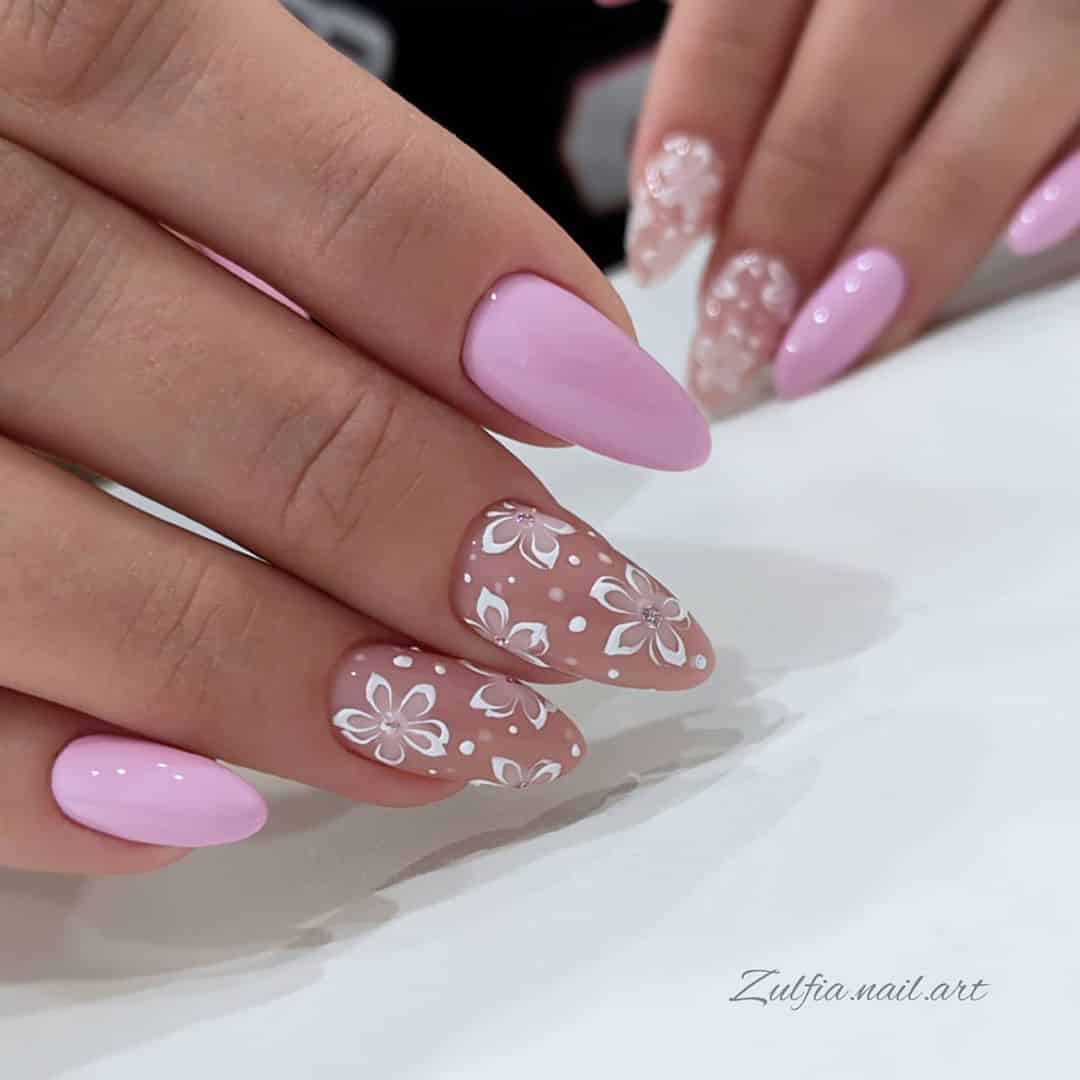 Тренд сезона — однотонное покрытие в сочетании с прозрачной базой, на которую нанесен рисунок — нежные цветы, кружево или обычные фольгированные полоски. Отлично смотрится и лунный маникюр с минималистичным выделением небольшими камнями.