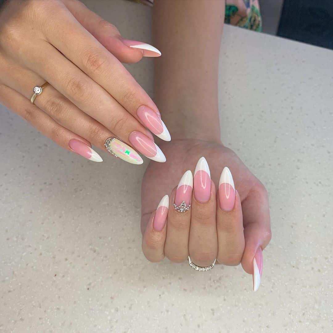 Острая форма ногтей сама по себе привлекает много внимания. Нейл-стилисты советуют оформить ее как можно проще — нюдовая база с выделением одного или двух ногтей. В качестве декора можно выбрать традиционные стразы, втирку, рисунки.