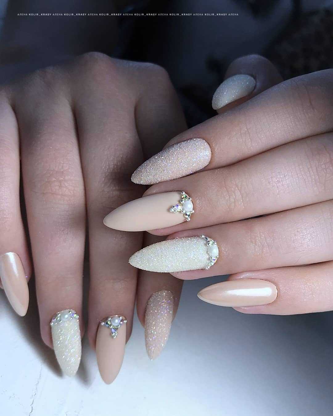 Миндаль считается самой распространенной формой ногтей, а кроме этого еще и самой универсальной. Именно на ней эффектнее всего будет смотреться свадебный вариант маникюра.