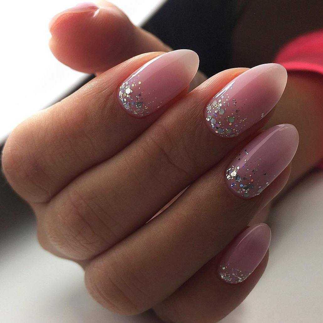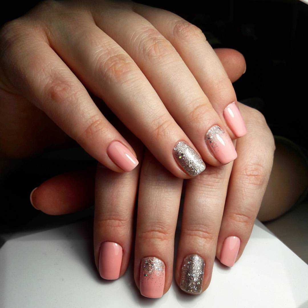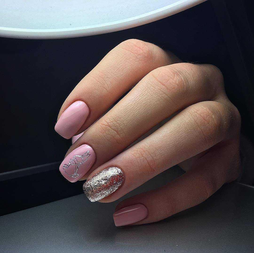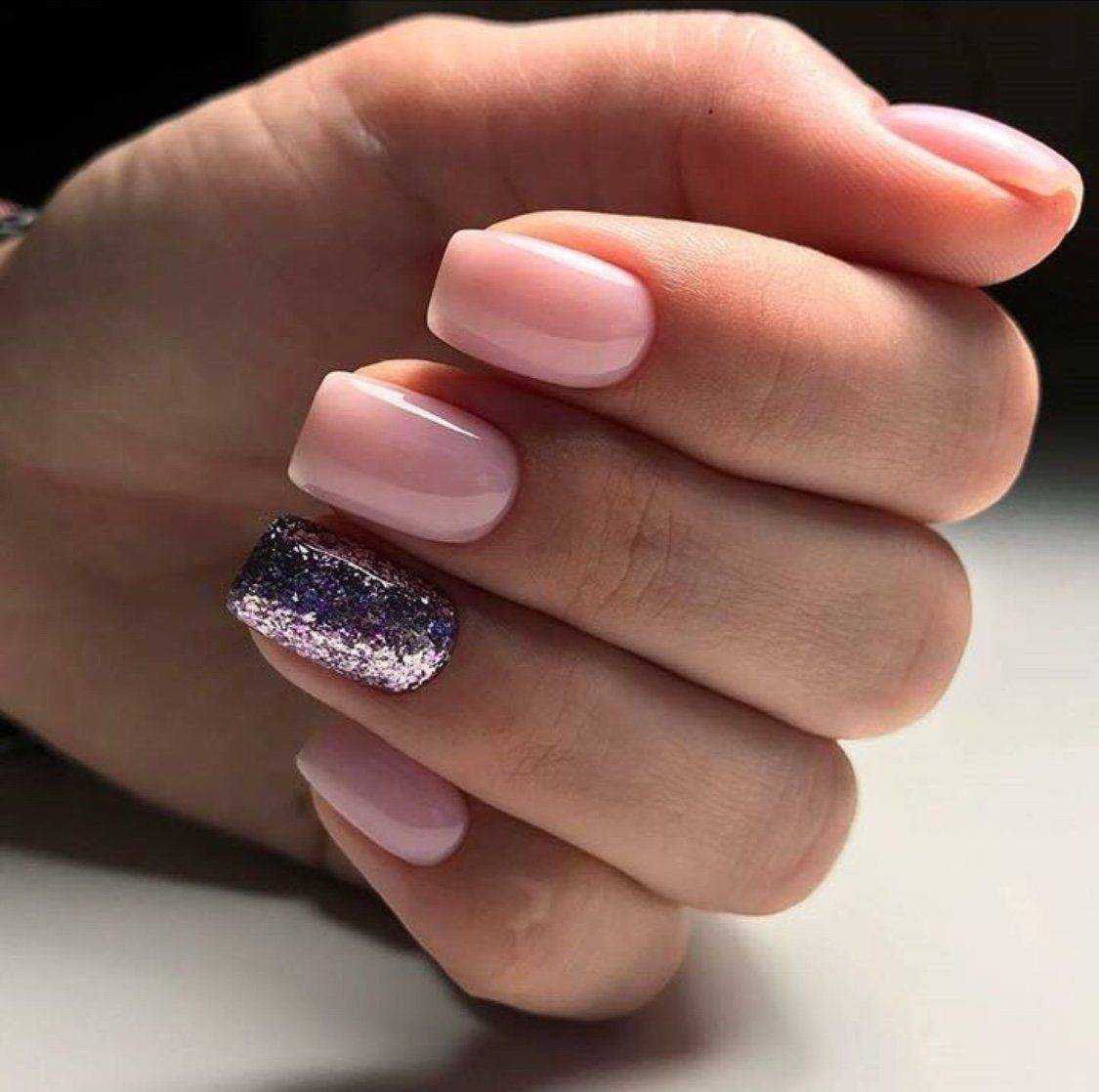 Праздничный — на пике популярности сегодня нейл-арт на прозрачном фоне. Можно сделать нежное розовое покрытие в 1 слой и нанести небольшое количество глиттера. Эффектно смотрится на указательном или безымянном пальце.