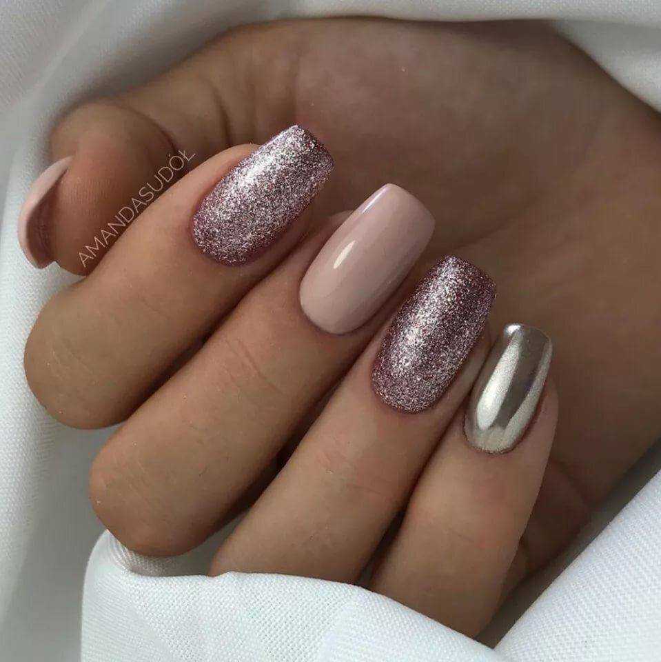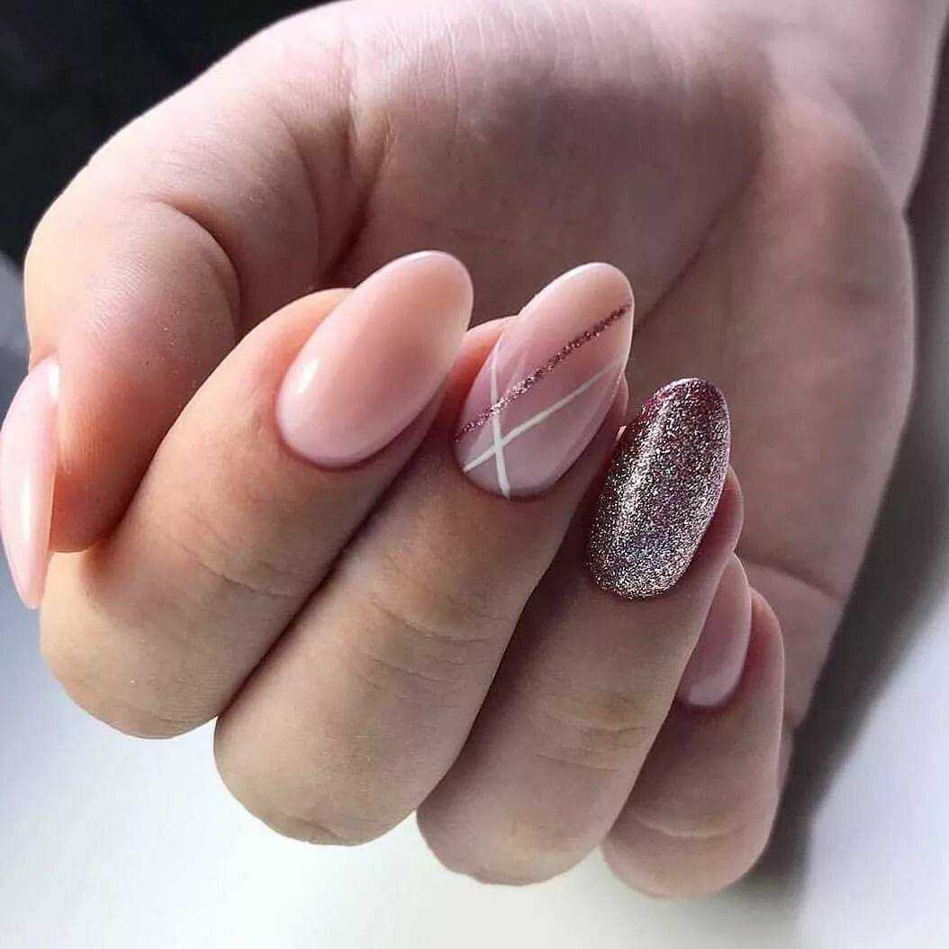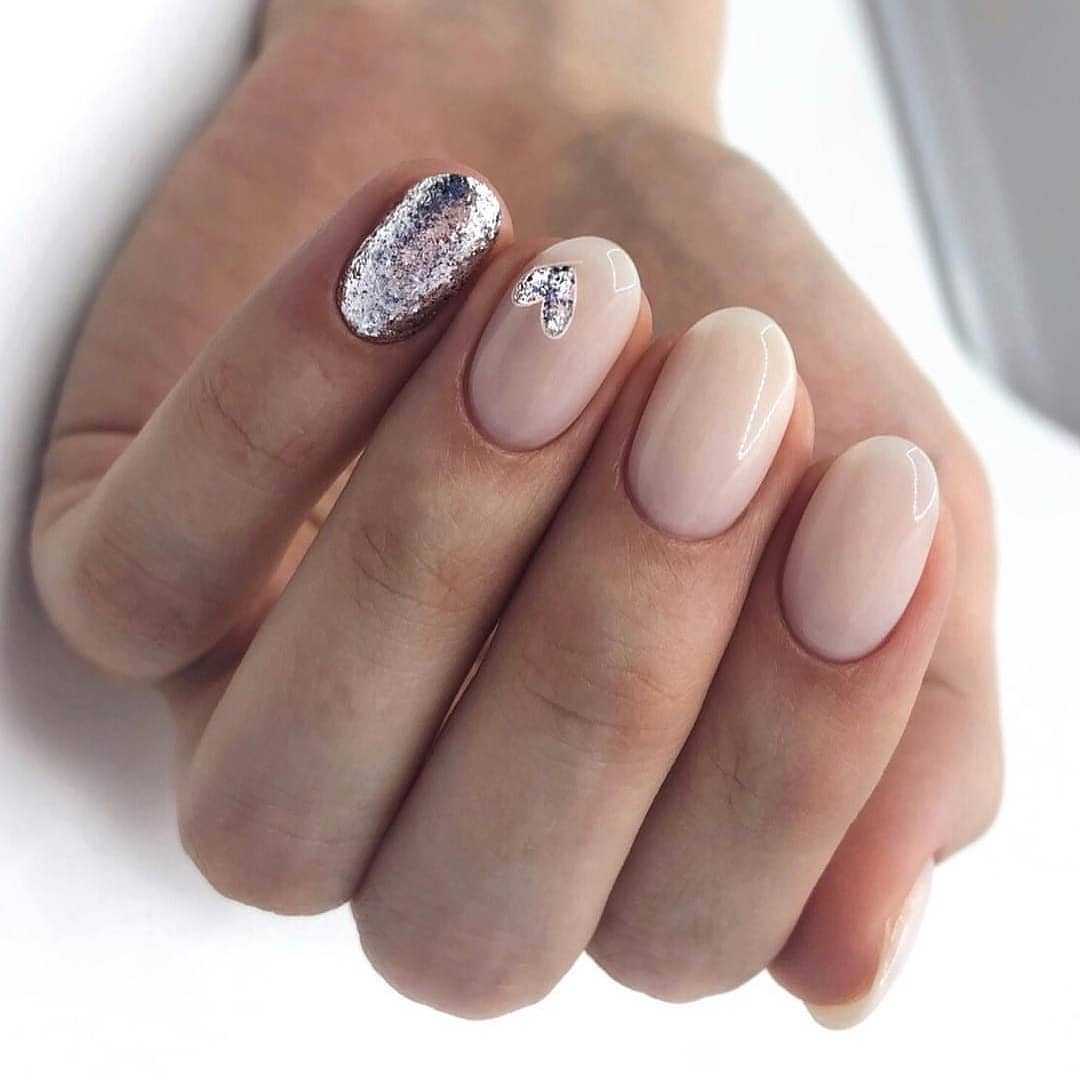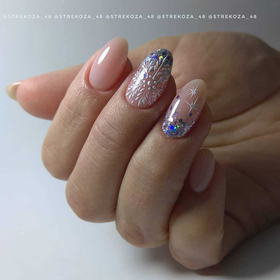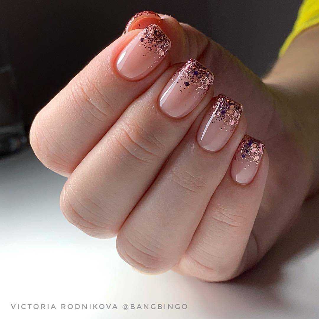 Праздничный — на пике популярности сегодня нейл-арт на прозрачном фоне. Можно сделать нежное розовое покрытие в 1 слой и нанести небольшое количество глиттера. Эффектно смотрится на указательном или безымянном пальце.