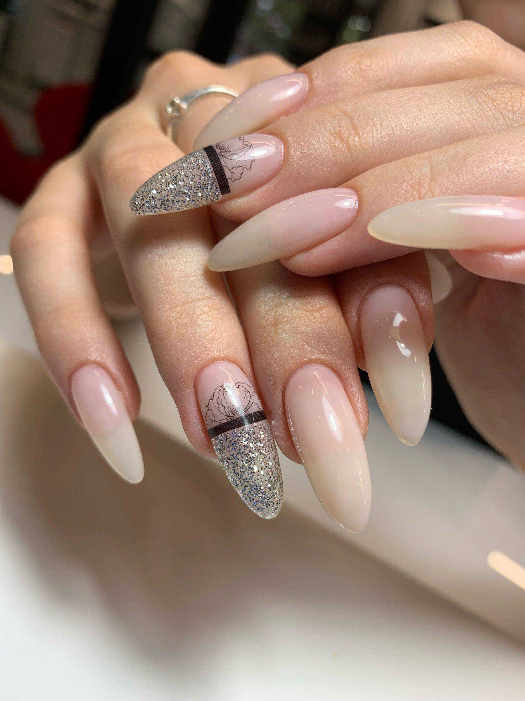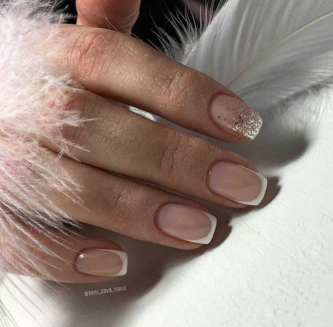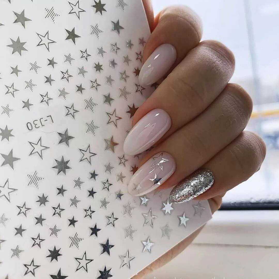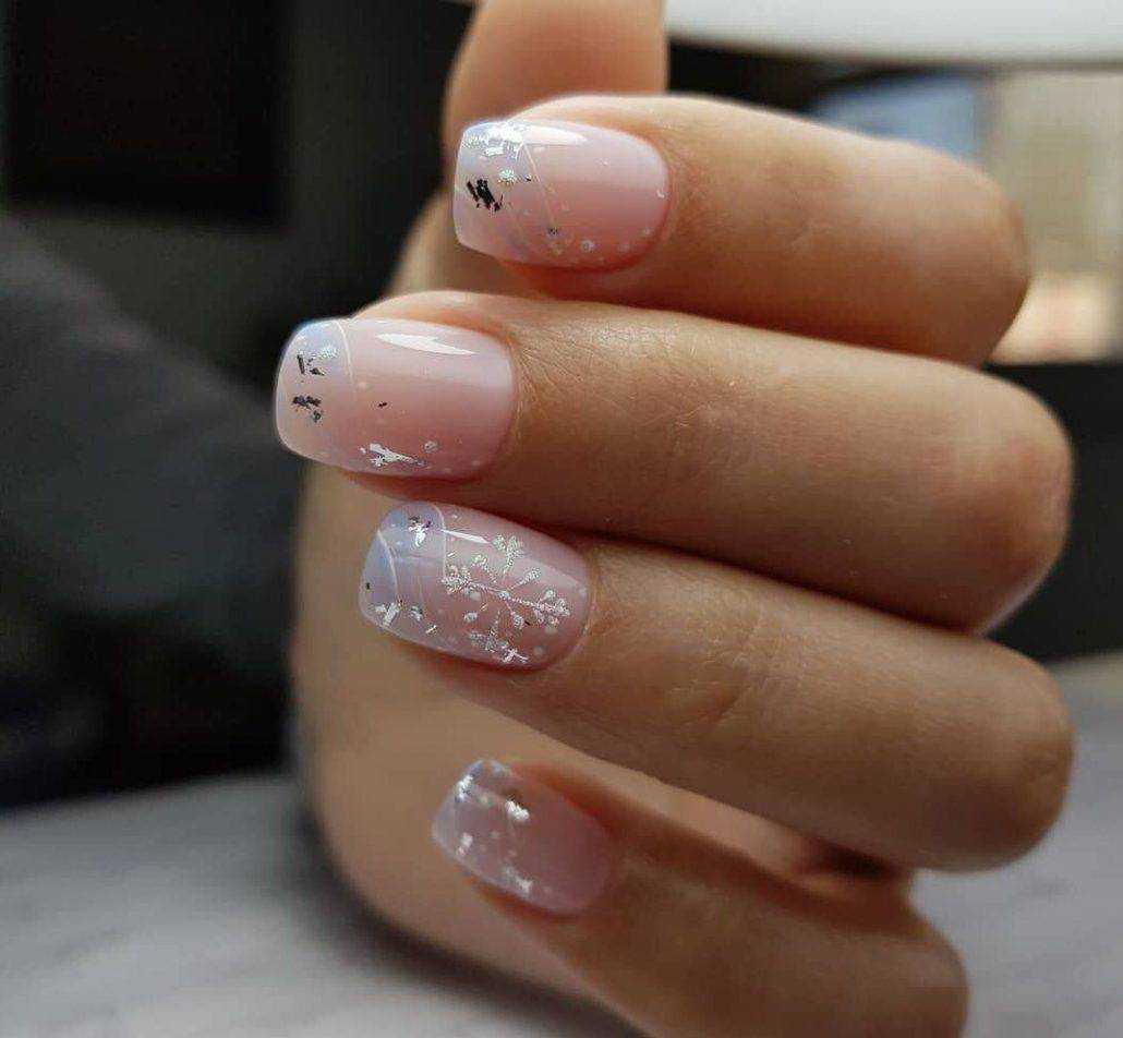 Праздничный — на пике популярности сегодня нейл-арт на прозрачном фоне. Можно сделать нежное розовое покрытие в 1 слой и нанести небольшое количество глиттера. Эффектно смотрится на указательном или безымянном пальце.