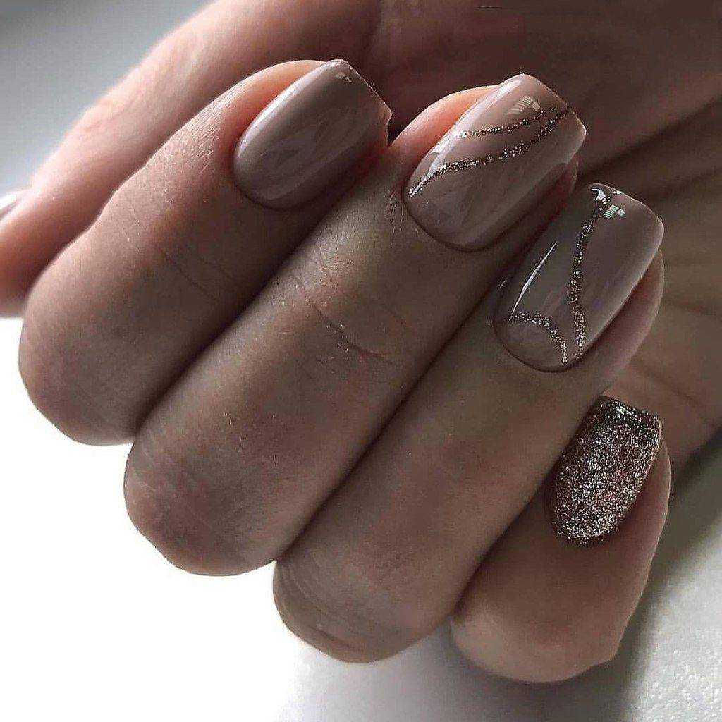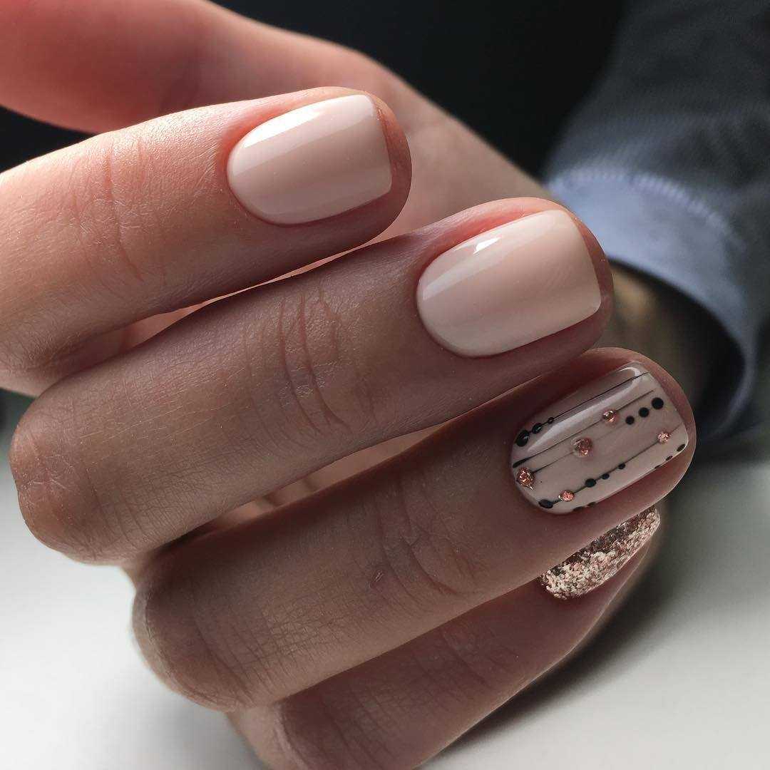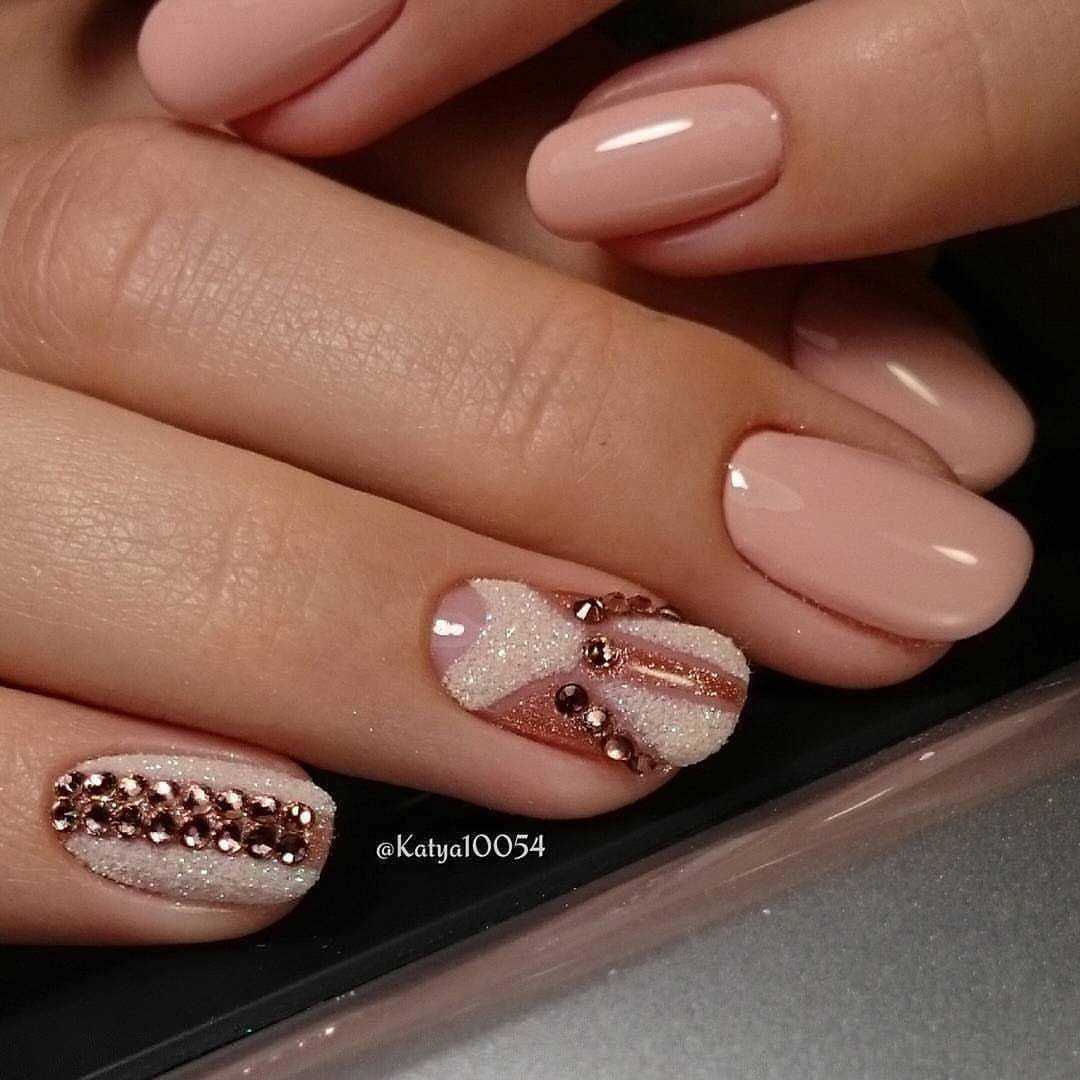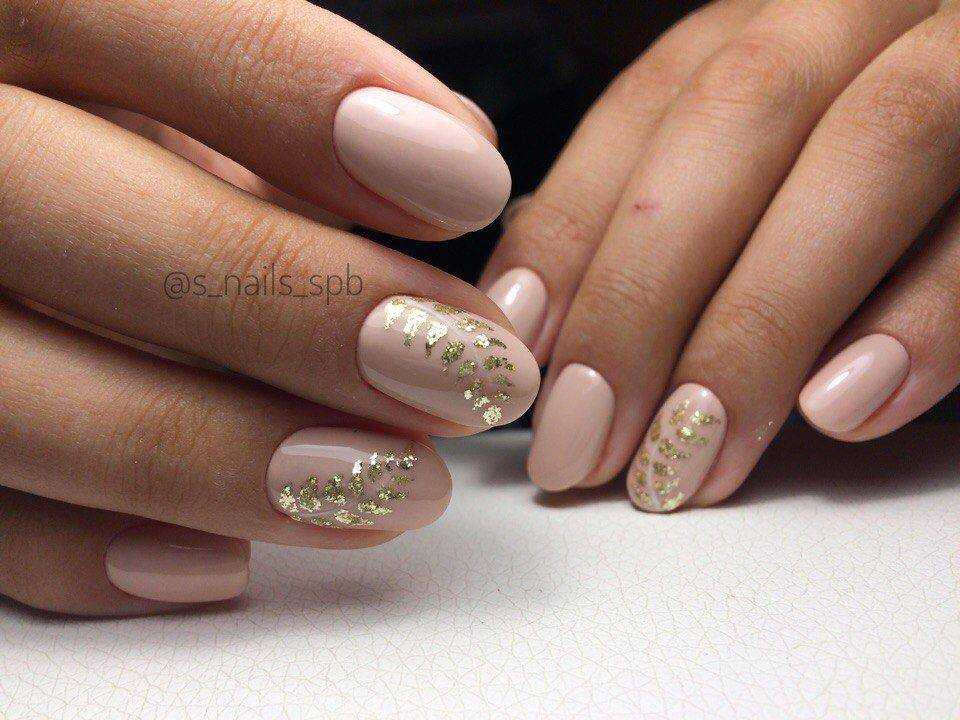 Нюдовые оттенки великолепно сочетаются с золотым декором. При этом маникюр не будет выглядеть слишком заметно и вызывающе. Все дело в схожей цветовой палитре, что позволяет создать удивительно красивые и визуально нежные нейл-арты.