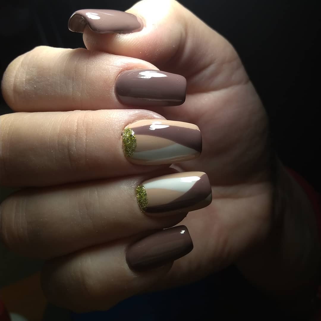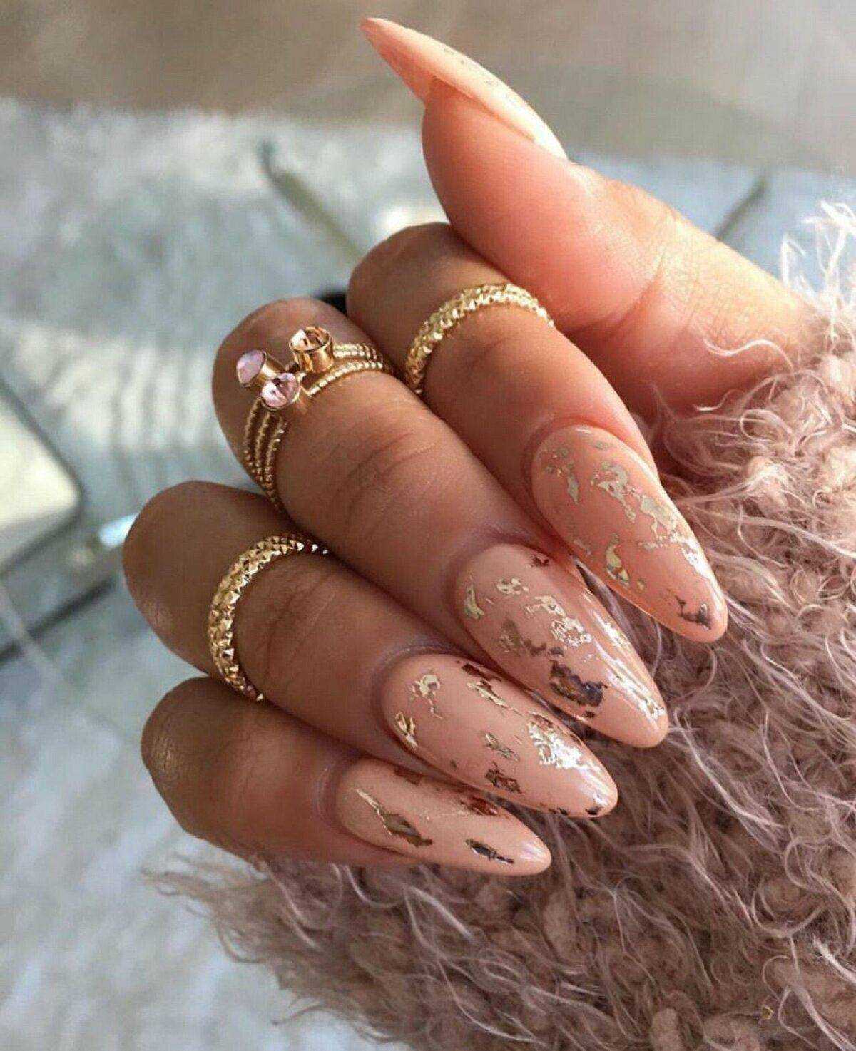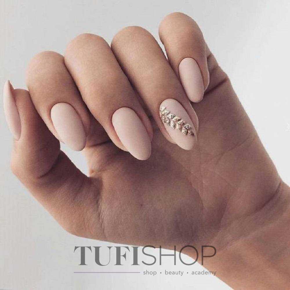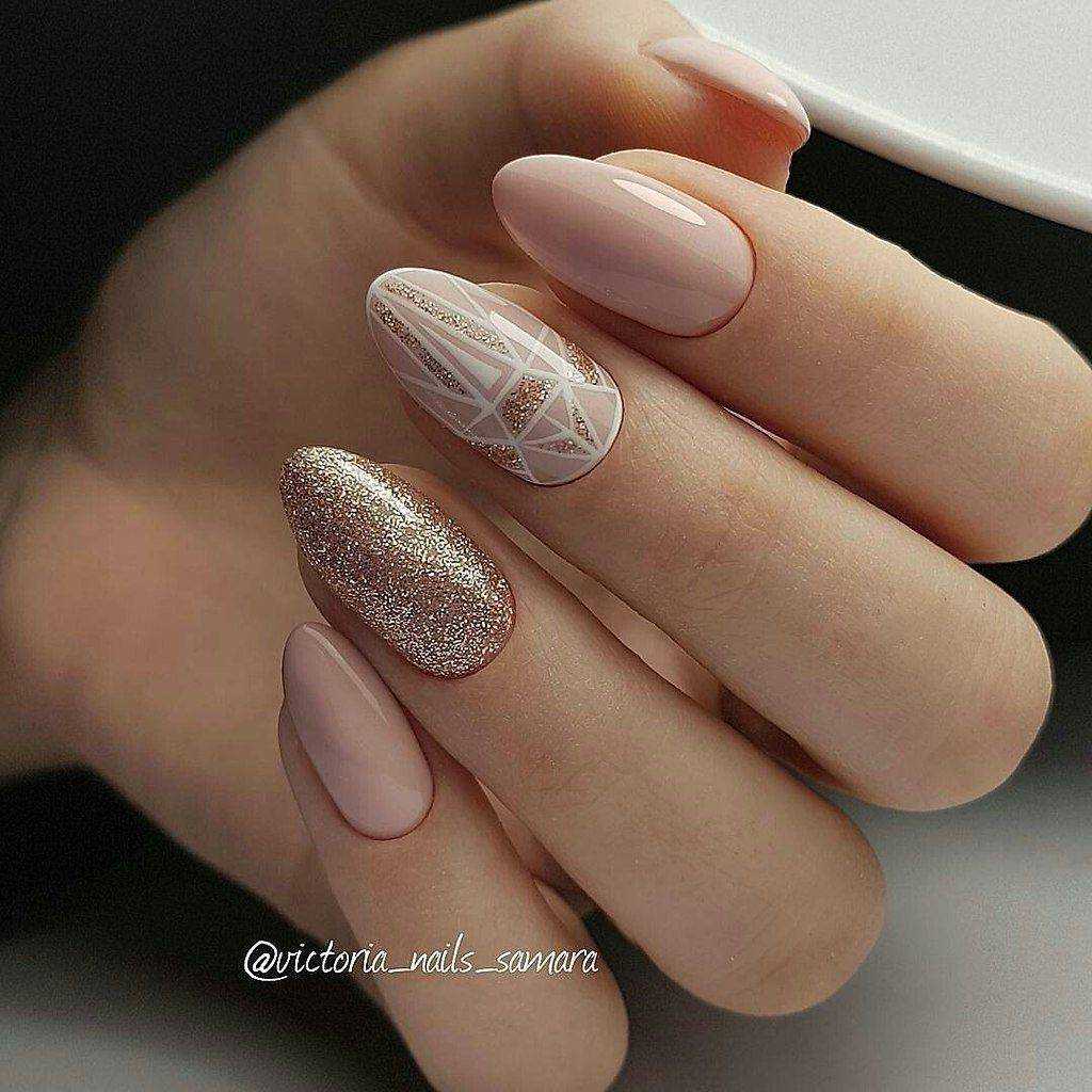 Нюдовые оттенки великолепно сочетаются с золотым декором. При этом маникюр не будет выглядеть слишком заметно и вызывающе. Все дело в схожей цветовой палитре, что позволяет создать удивительно красивые и визуально нежные нейл-арты.