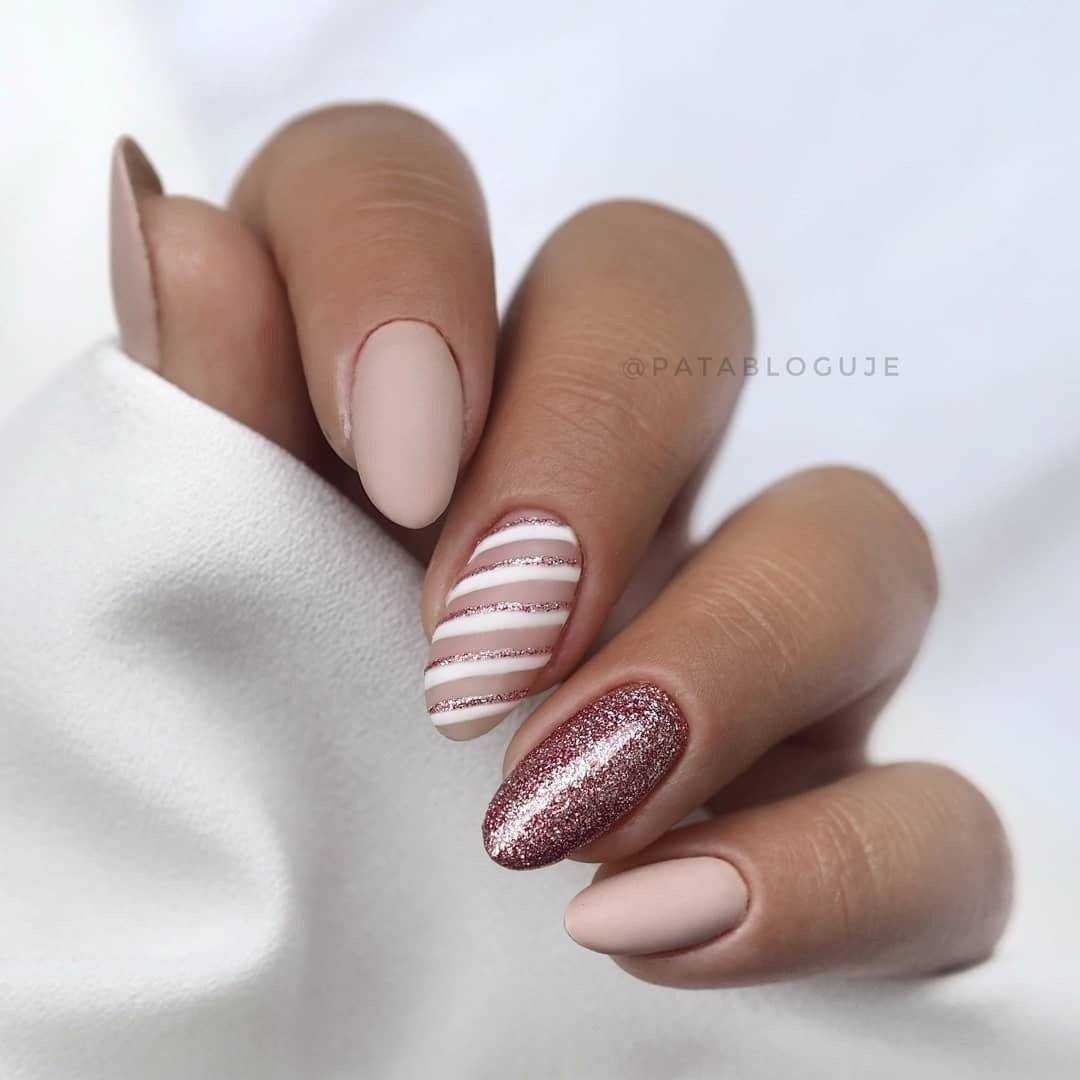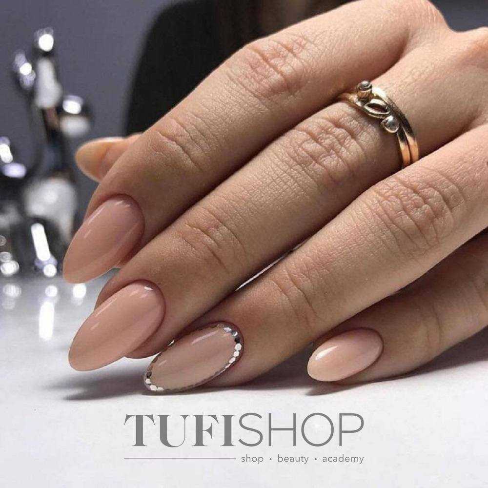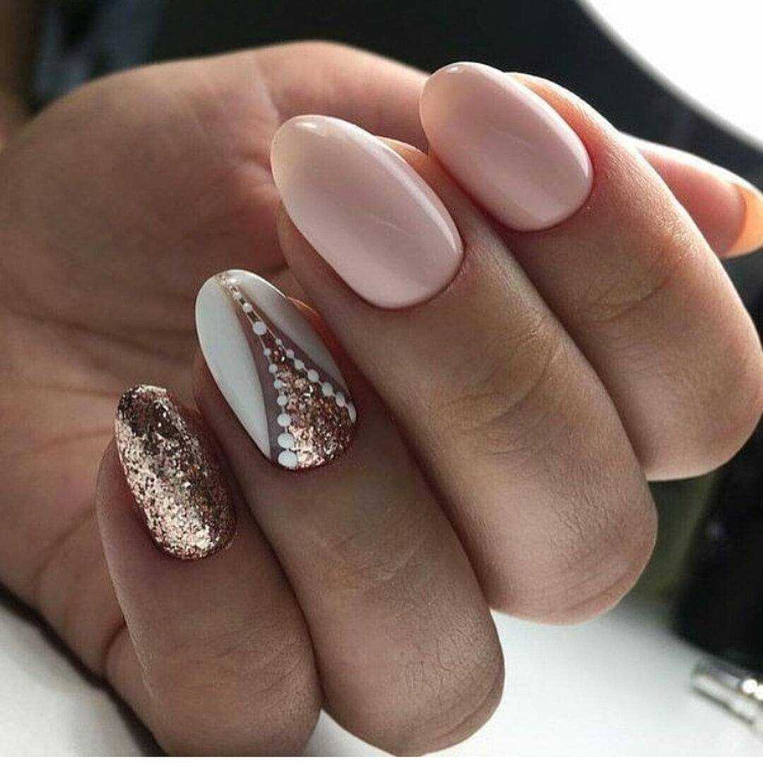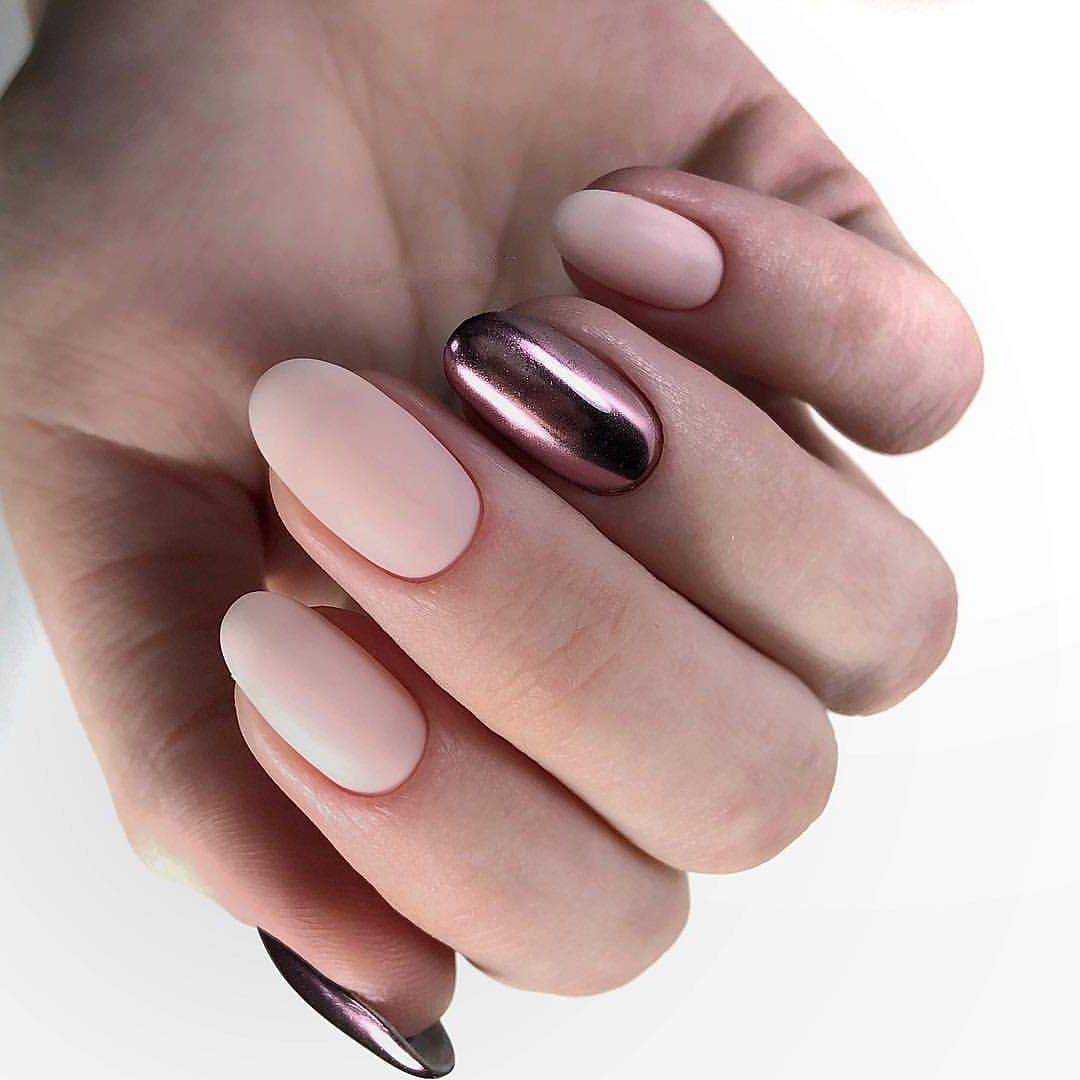 Нюдовые оттенки великолепно сочетаются с золотым декором. При этом маникюр не будет выглядеть слишком заметно и вызывающе. Все дело в схожей цветовой палитре, что позволяет создать удивительно красивые и визуально нежные нейл-арты.
