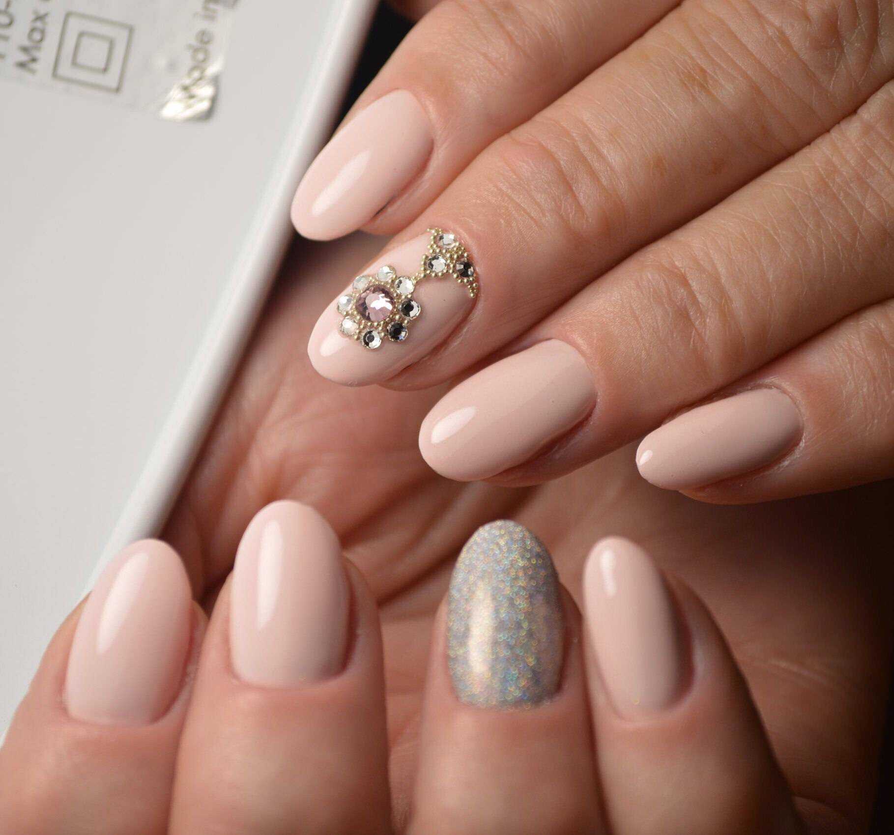 Если у вас насыщенный график, то покрытые блестящим лаком ногти можно дополнить несколькими ослепительными стразами. Сдержанный дневной маникюр за пару минут засияет новыми яркими красками, которые будут уместны на любом вечернем мероприятии.