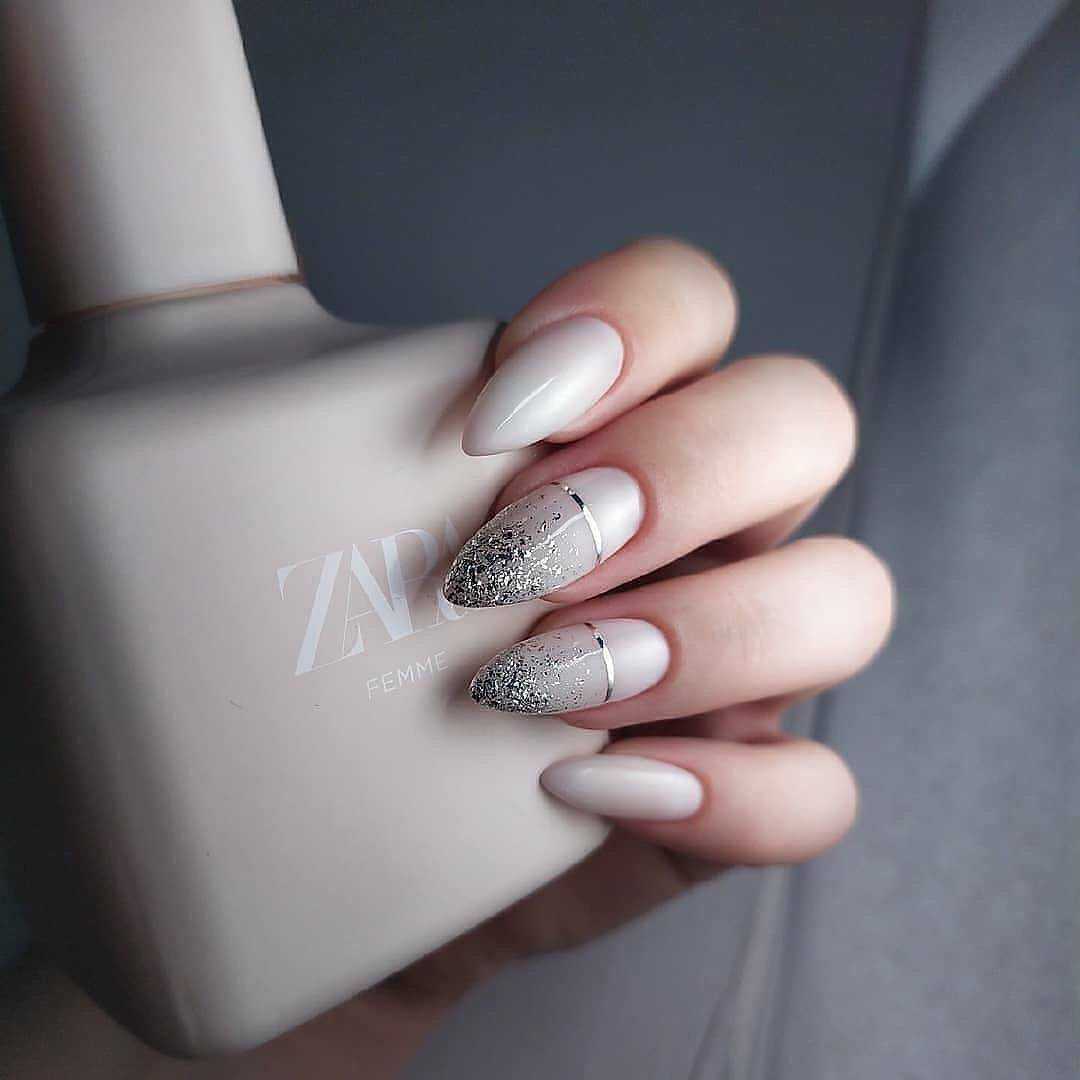 Не все любят белый лак, но если нанести крупные геометрические узоры, объемные камни, либо украсить фольгой, ногтевая пластина будет выглядеть элегантно и изысканно.