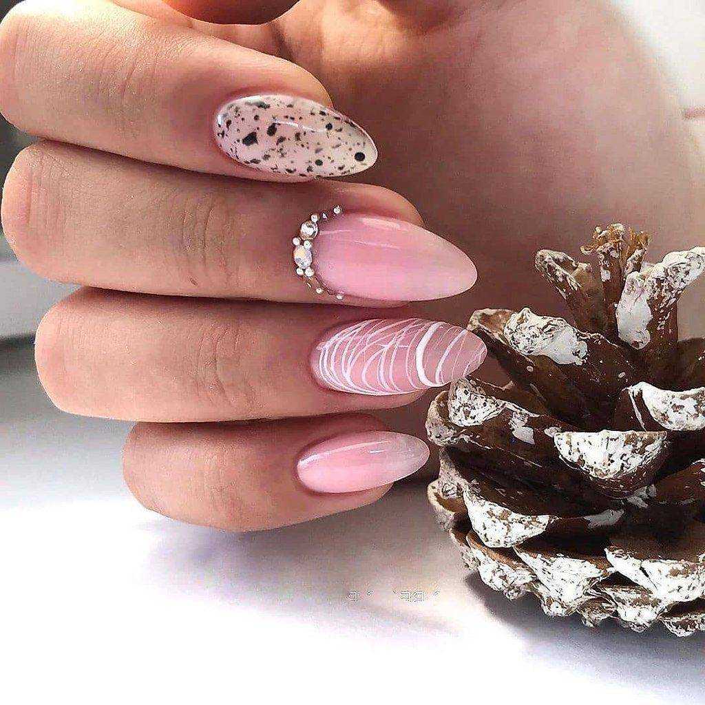 Фото-новинки, которые можно повторить этими материалами, – эффект краски, разбрызганной по поверхности. В этом случае одни ногти окрашиваются в черный, другие – в контрастный цвет (белый, бежевый, розовый и т.д.), на который наносятся темные брызги, капли или точки, имитирующие краску. Они могут располагаться как хаотично, так и в определенной последовательности. Первый вариант сделает маникюр легким, второй – сдержанным.