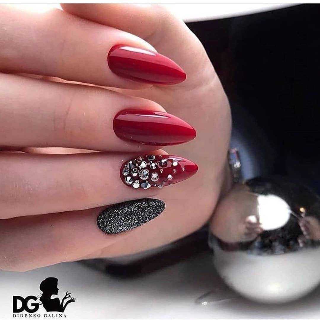Как вы понимаете, для столь оригинального оттенка блёсток следует подобрать достойное основание, и в этом примере, нейл-дизайнеры предлагают отдать предпочтение не только контрастным светлым тонам. Тёмный маникюр с блестящими угольно-чёрными деталями смотрится весьма интересно, необычно и привлекательно. Это может быть растяжка сверкающих фрагментов, чёткая прорисовка свободного края ногтевой пластины и многие другие идеи.