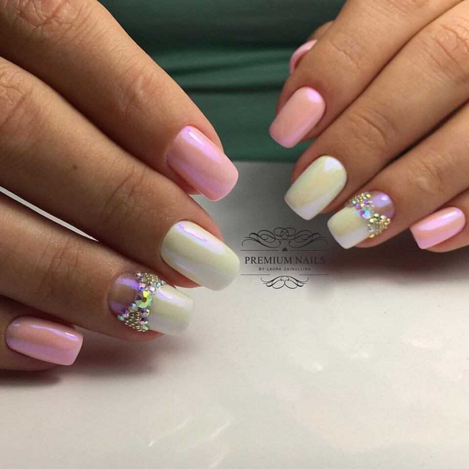 Классическими цветами для свадебного маникюра являются белый и розовый, однако часто выбирают и другие пастельные тона, которые удачно гармонируют с нарядом невесты.