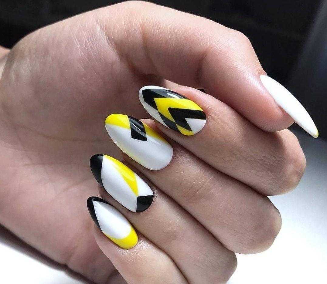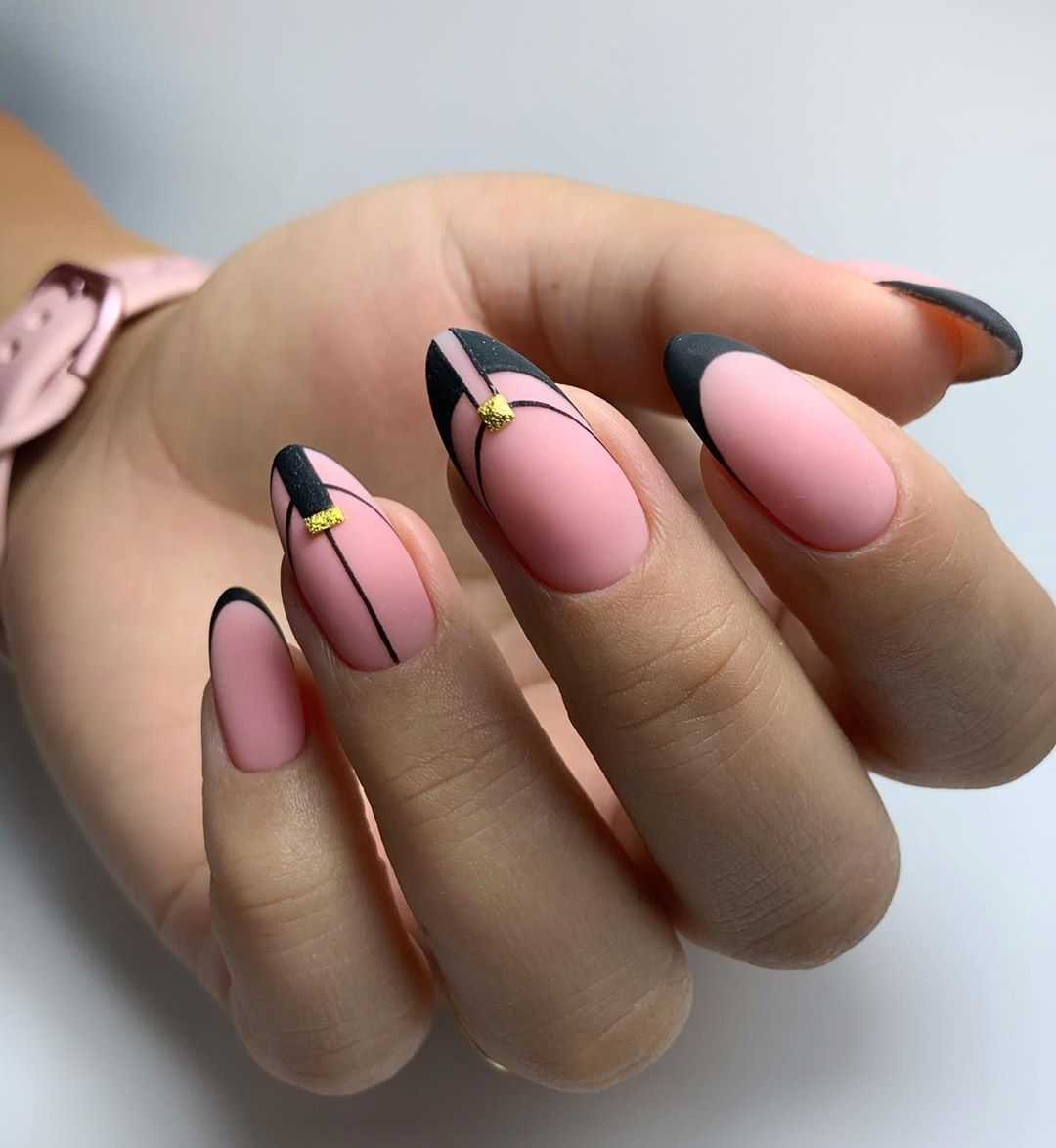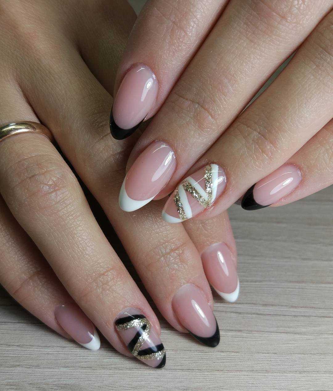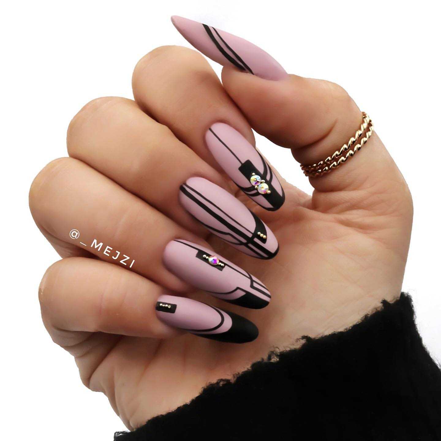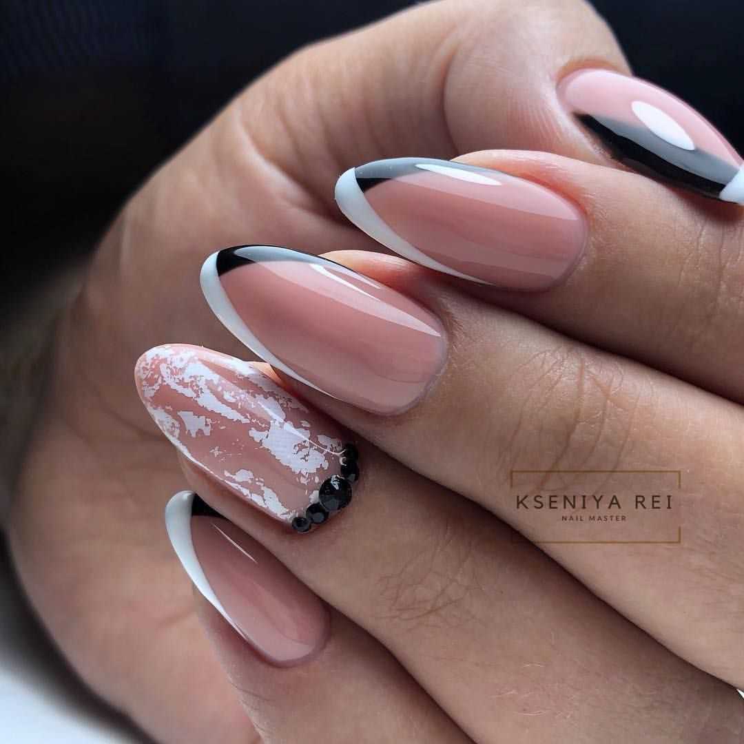 Маникюр на фото ниже отвечает сразу трем модным тенденциям этого года. Он выполнен в трех цветах: нежно-розовом, белом и черном. Черный геометрический рисунок в виде треугольников идеально вписывается в общую концепцию. Еще одна модная тенденция: в середине каждого треугольника можно увидеть стразы. Такую идею стоит взять на заметку девушкам с квадратной формой ногтей.