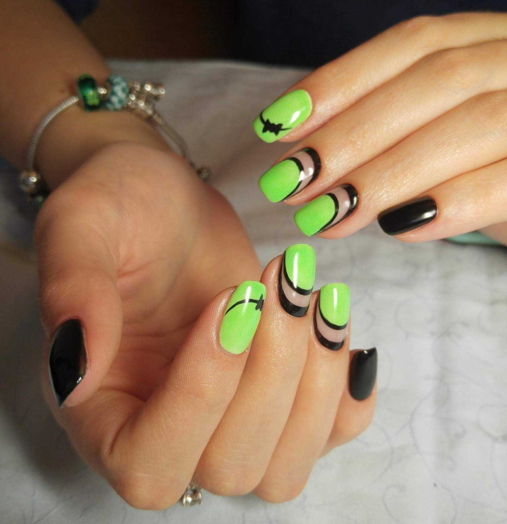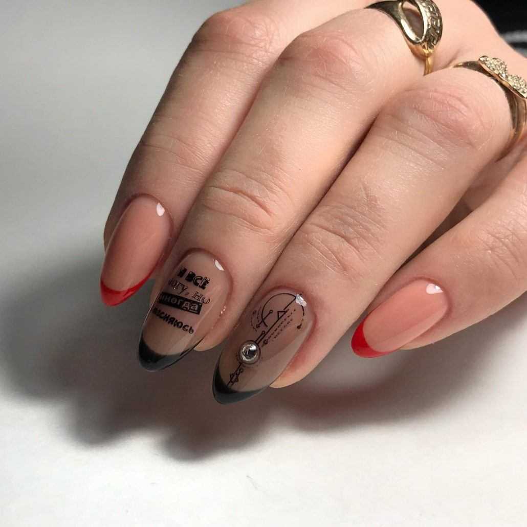 Кричащий френч из сочетания красного и черного, рисунок на одной из частей пластины или ровная полоска через весь ноготь – все это может стать частью такого вида нэйл-арта.