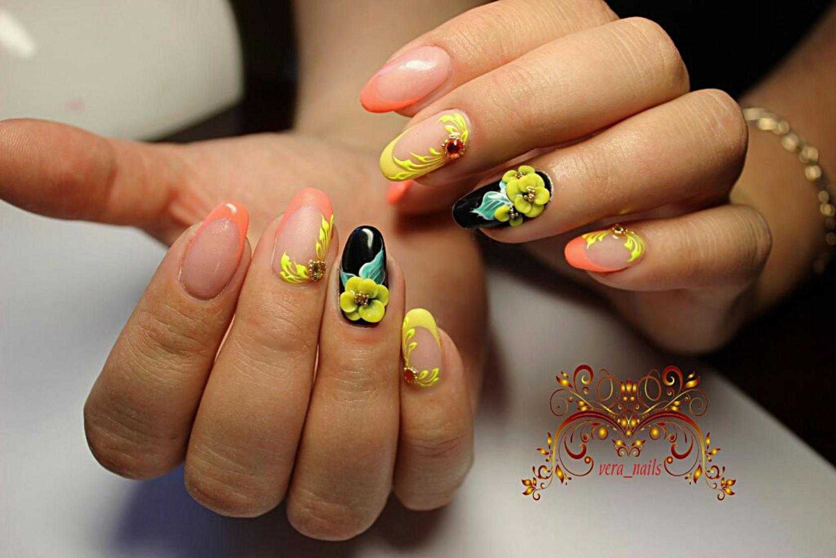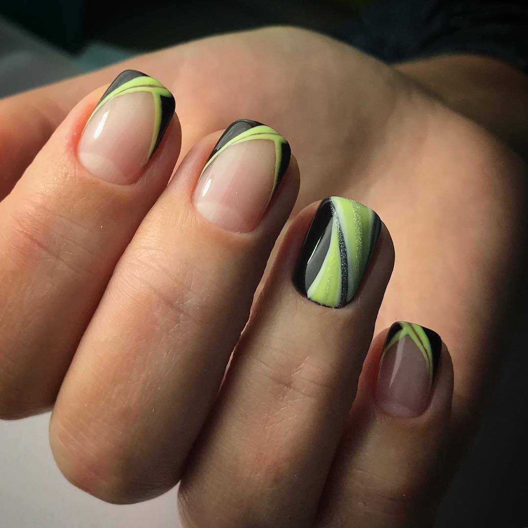 Френч настолько универсальная техника, что может выглядеть оригинально в любой цветовой гамме. В весенний и летний период популярностью пользуются сочные яркие нейл-арты в желтом, ярко-розовом, синем и даже черном цвете.