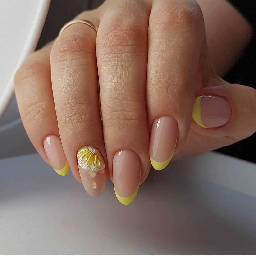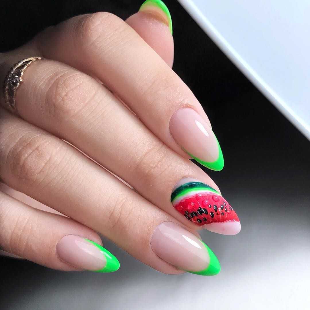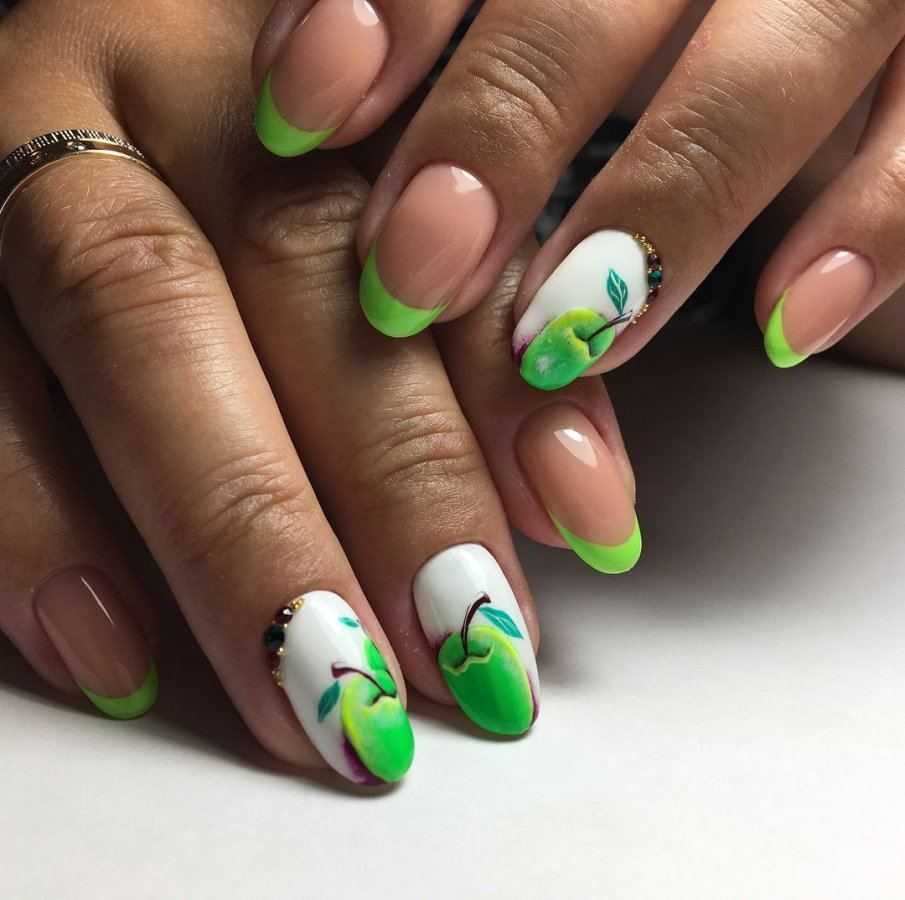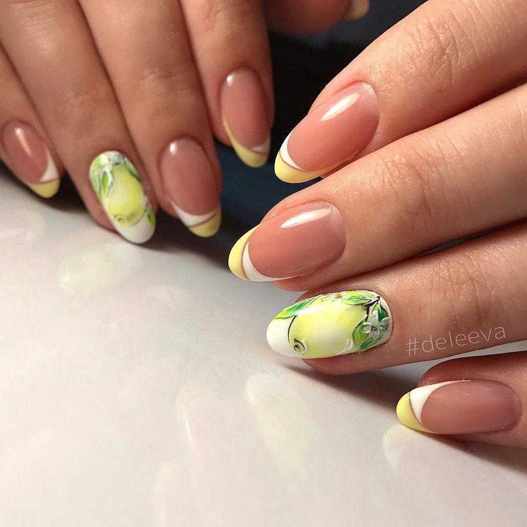 Цветной френч отлично гармонирует с декором в виде фруктов: лимонов, арбузов, в виде флористики, геометрии, мультяшными героями и т.д. Если вы используете яркий цвет для выделения края ногтевой пластины, то помните, что остальная часть ногтя должна быть окрашена в светлый оттенок. Это должен быть спокойный серый, молочный, полупрозрачный оттенки.