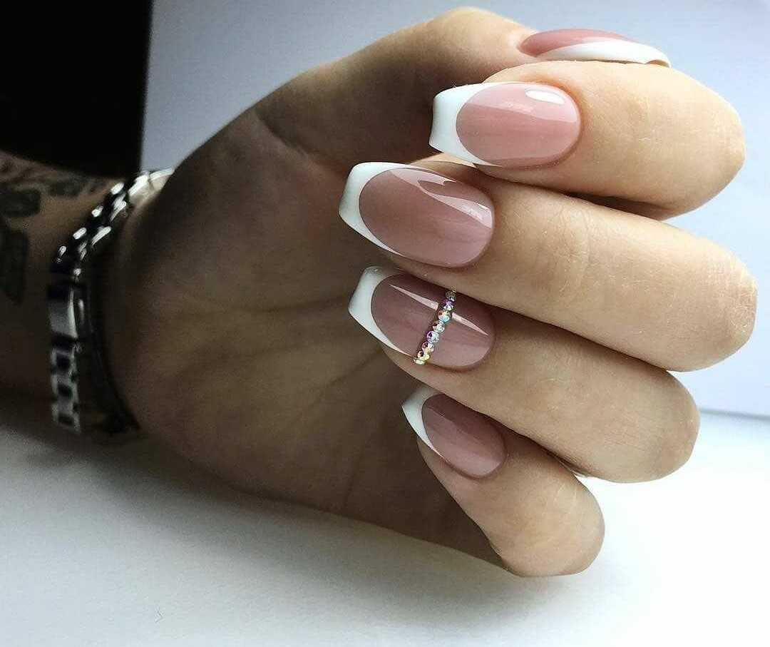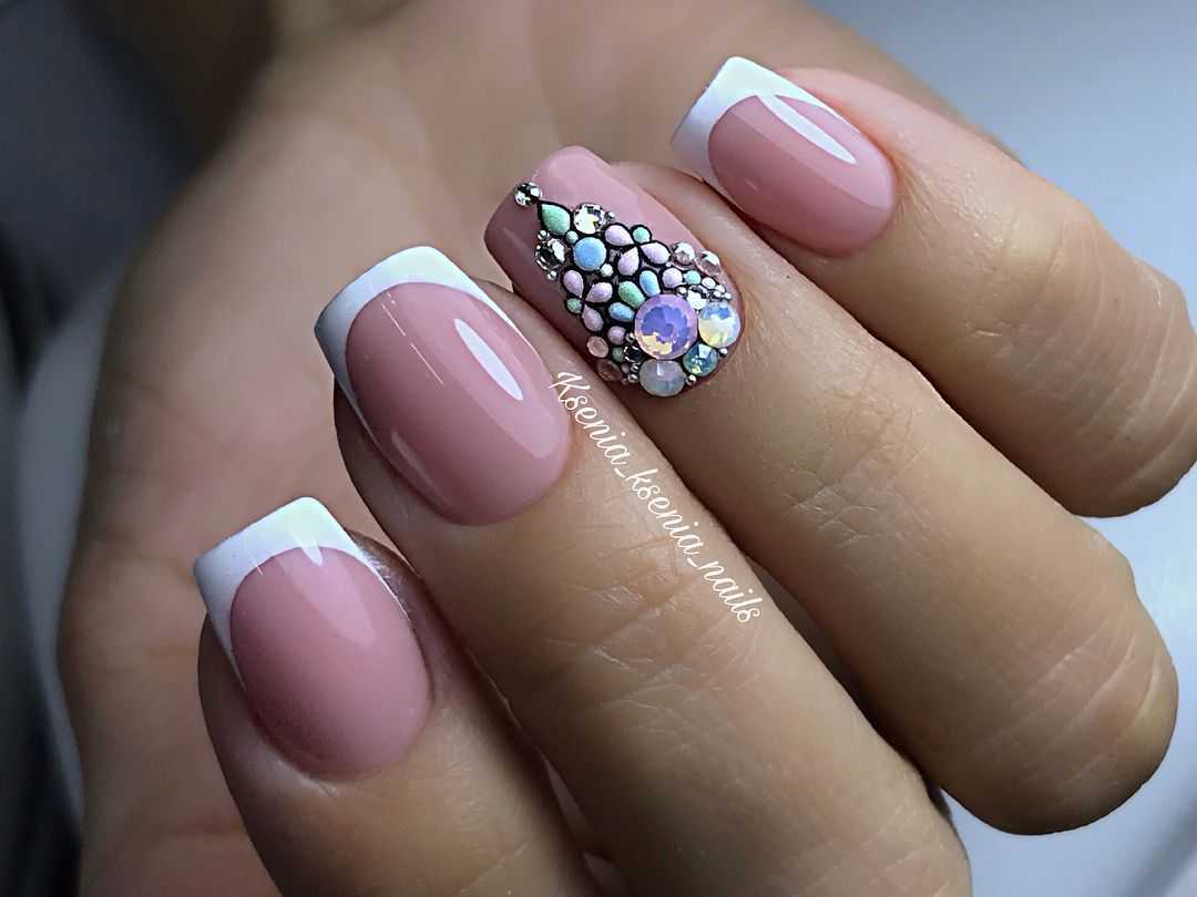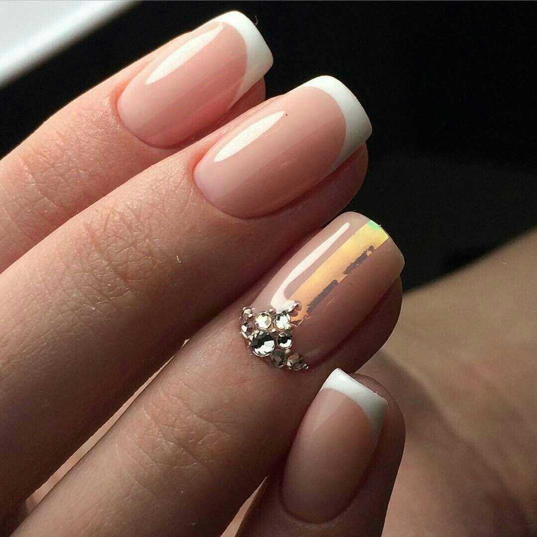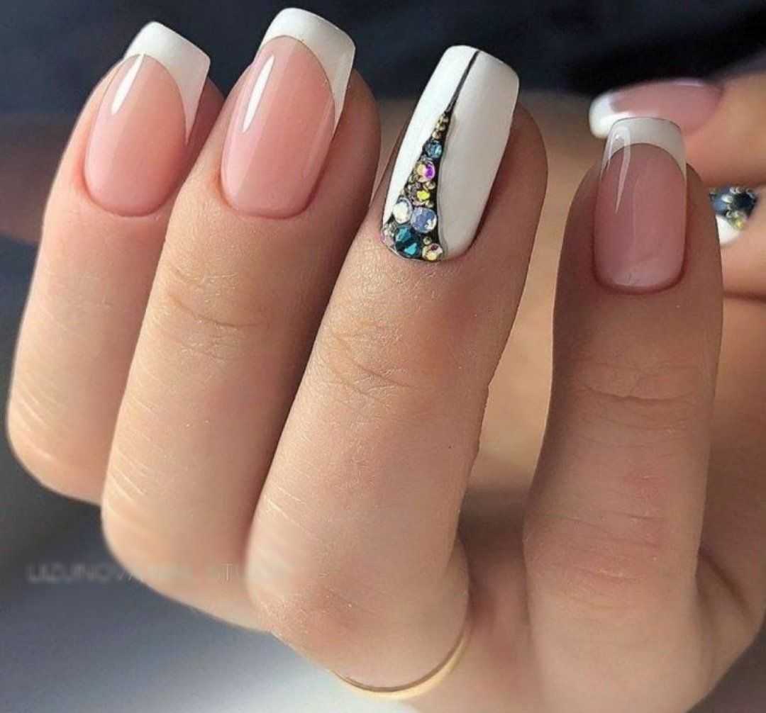 Закрепим уже пройденный урок: самый модный белый френч со стразами подразумевает их расположение максимально близко к кутикуле.