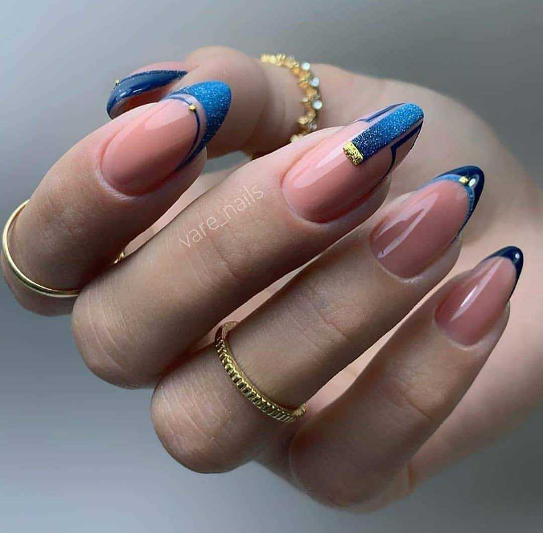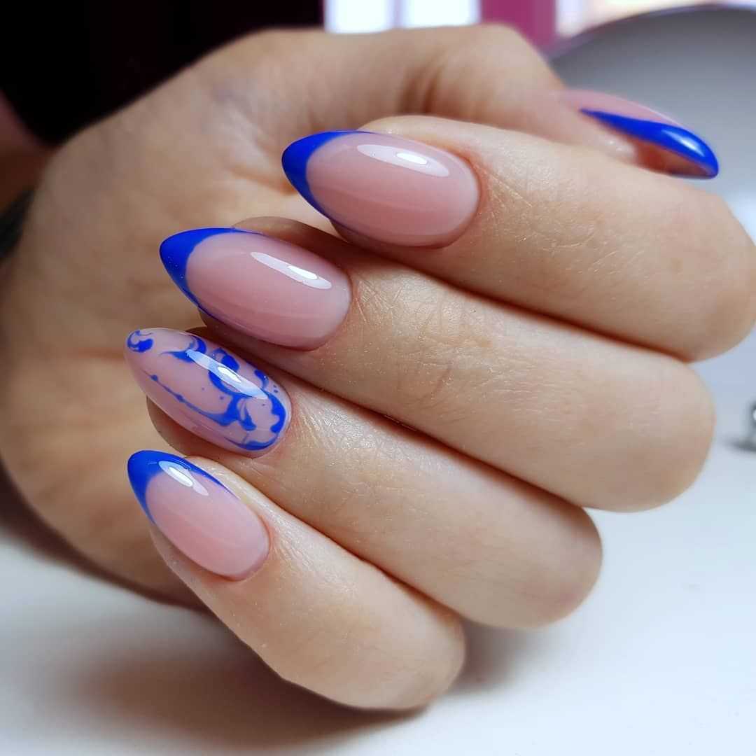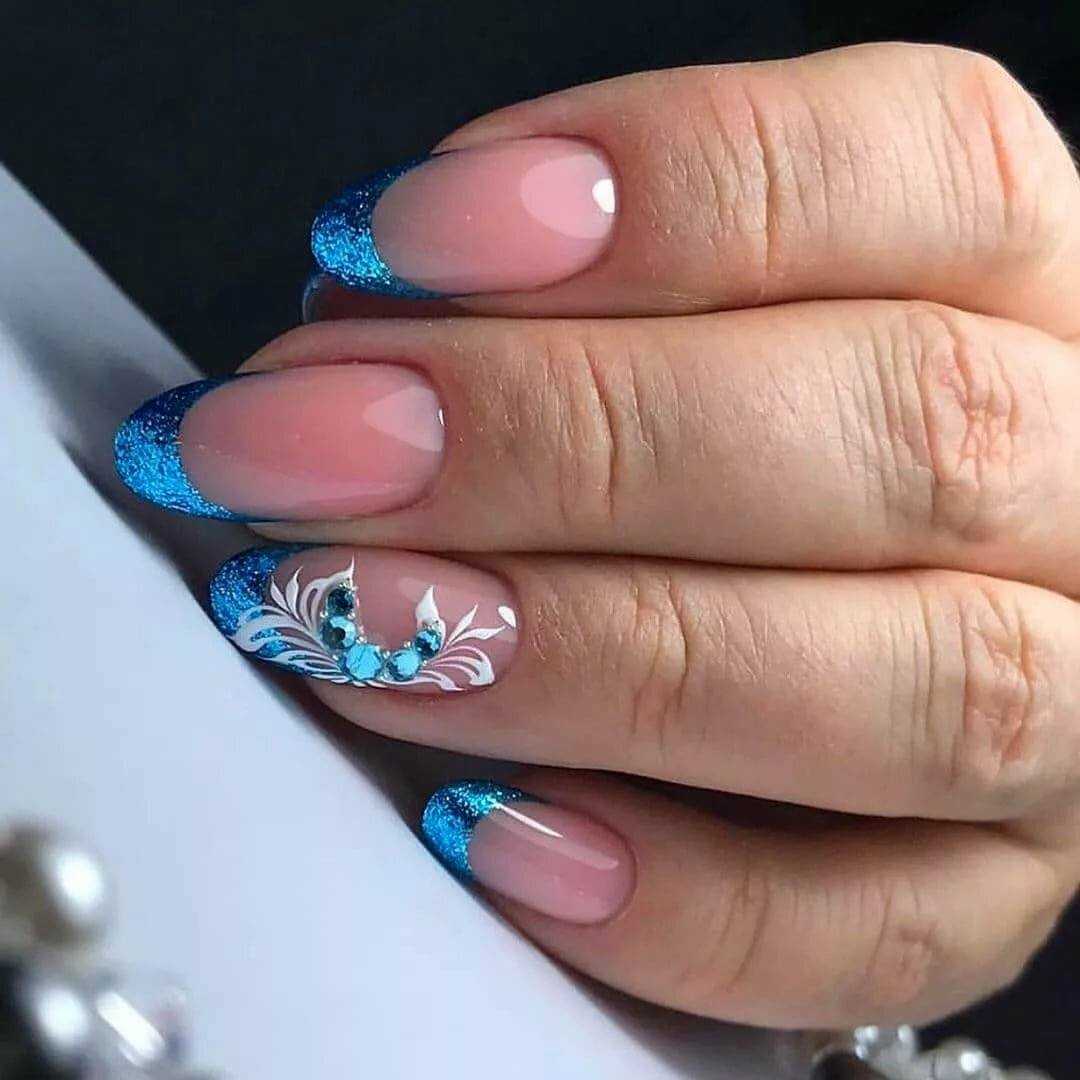 Голубой френч с рисунком на безымянном пальце выбирайте, если в вашем гардеробе преобладают нейтральные цвета: черный, серый, белый. Такой дизайн станет ярким акцентом.