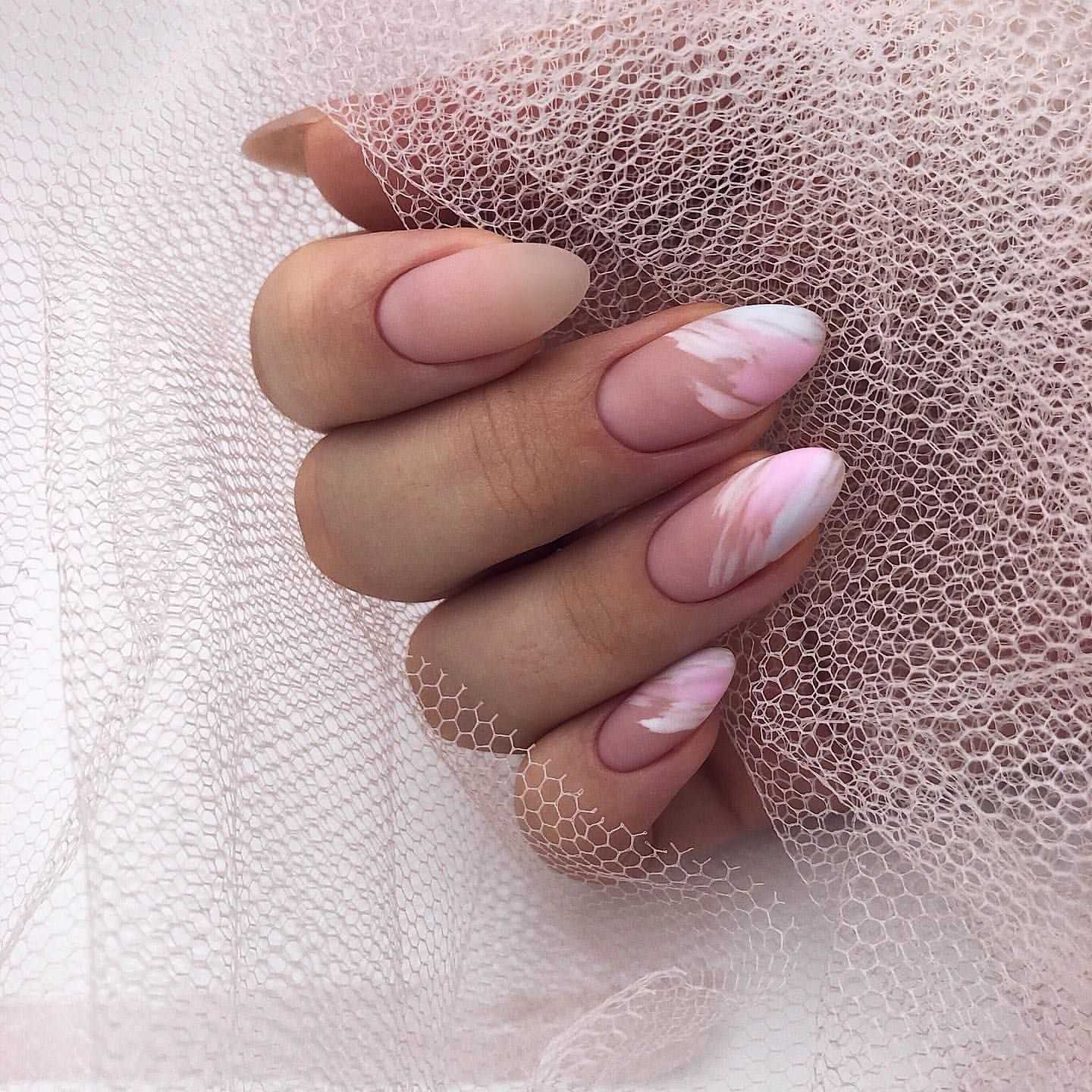Такой маникюр предполагает оттенки лаванды, розовых лепестков, экрю, персик и другие. Классическим вариантом считаются оттенки бежевого, которые будет сочетаться с любым образом.