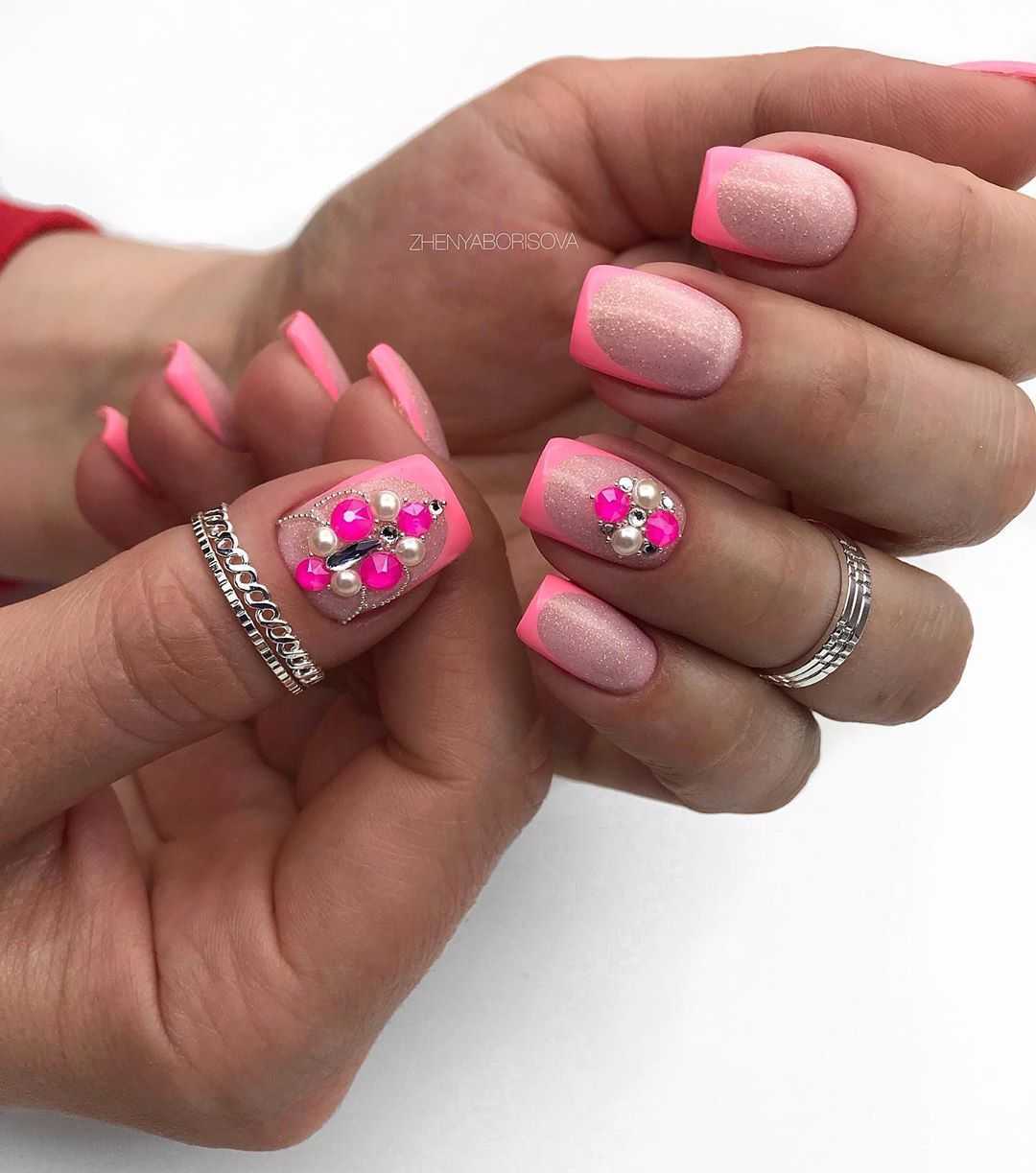 Френч розовый с белым — в этом дизайне также собраны самые модные элементы: стразы, черный лак и глиттер. Но он больше подойдет девушкам, которые предпочитают классические «девичьи» узоры и кружева.