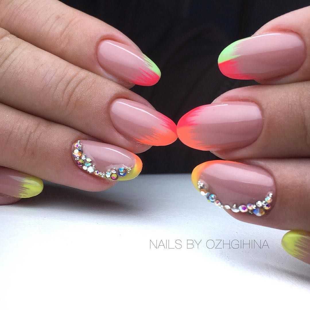 Сегодня все больший спрос получает оформление ногтей в дизайне френч, где кончики ногтей покрыты разноцветными оттенками и элементами декора (стразы, блестки и др.).
