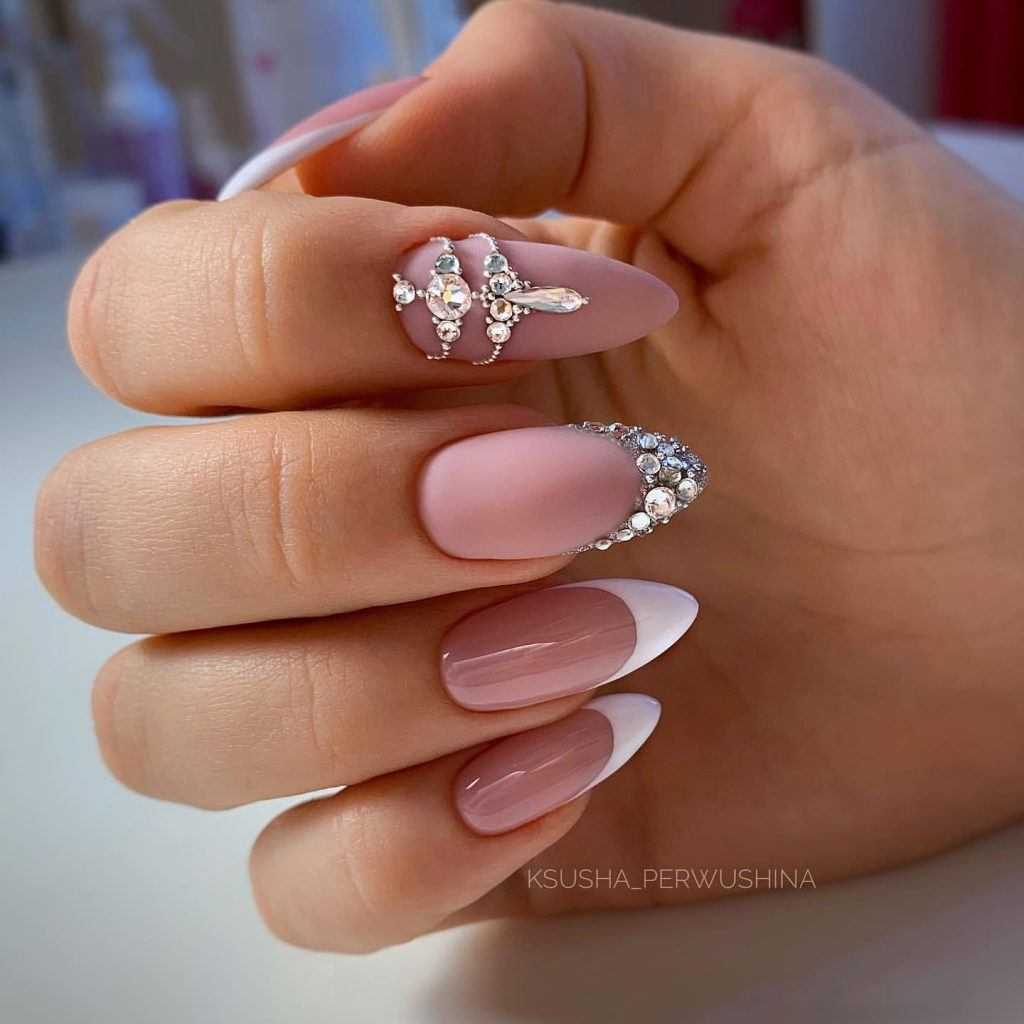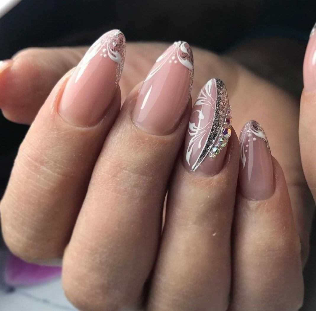 На пике моды находятся ногтевые пластины, украшенные бисером, металлическими нитями, пайетками и стразами. С их помощью мастер выкладывает замысловатые узоры, которые привносят в композицию смысл. Любительницы изысканной роскоши могут украсить свои пальцы кристаллами Сваровски.