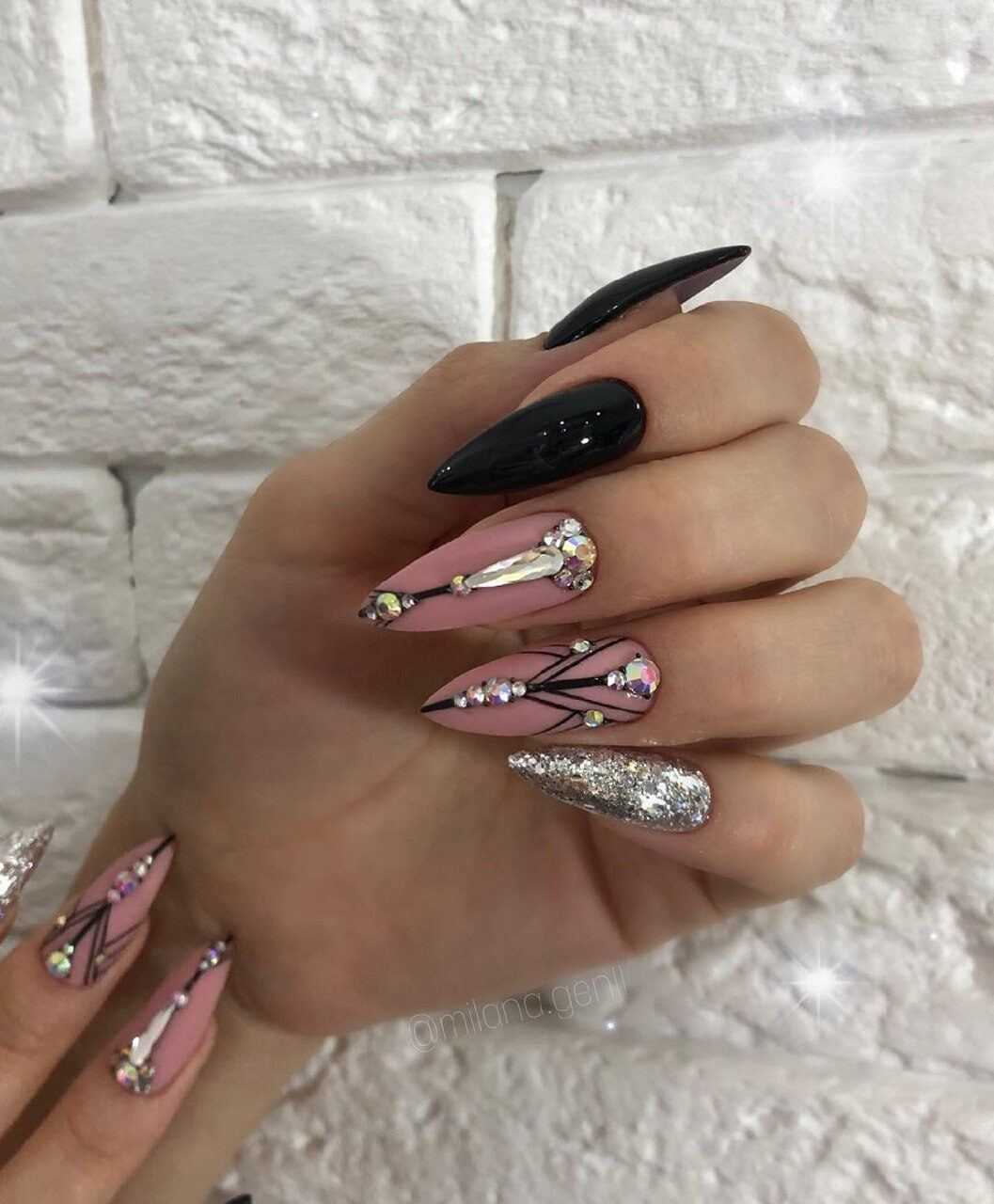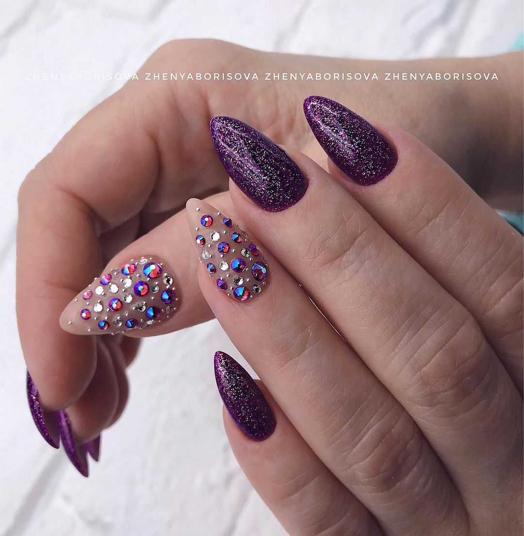 Но и самые креативные идеи отлично “подружатся” с миндальной формой. Увеличенная длина пластины позволяет разместить на ней блестки, стразы, наклейки и другие украшения, не создав при этом ощущения перегруженности и отсутствия вкуса.