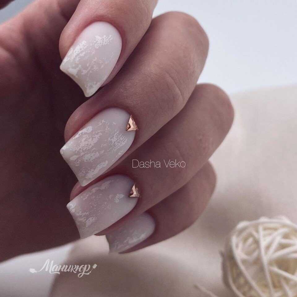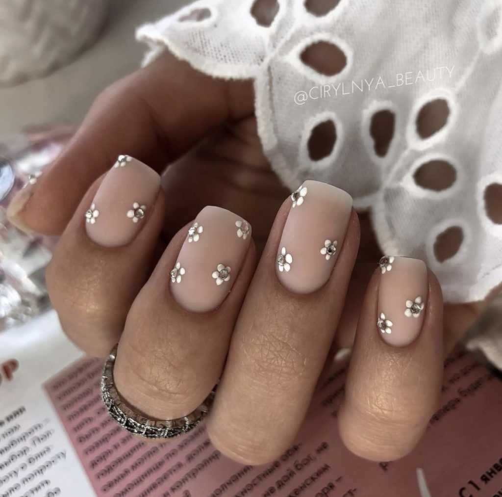 Если вы сторонница скромного маникюра в нюдовой гамме, вас должен вдохновить матовый бежевый маникюр. Чтобы сделать его чуть выразительнее можно добавить страз, глиттера на кончики или кутикулу.