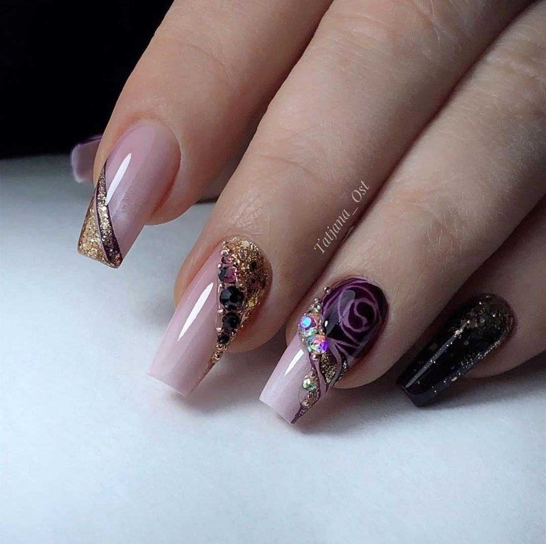 Стразы и блёстки – наиболее популярный декор в нейл-индустрии. Поэтому, вариации маникюра, выполненные с различными вариациями тандемного сочетания стразов и блёсток, всегда занимают топовые позиции. Это может проявляться на одной руке в виде рамок, выполненных глиттером или узоров из стразов, которые чередуются между собой, вариаций прорисовки рисунков блестящими штрихами с дополнением в виде жемчуга, бусин, и многих других идеи. При этом стразы и блёстки могут иметь разную форму, размеры и окрас. Все возможные вариации дизайна в этом случае перечислить просто невозможно.