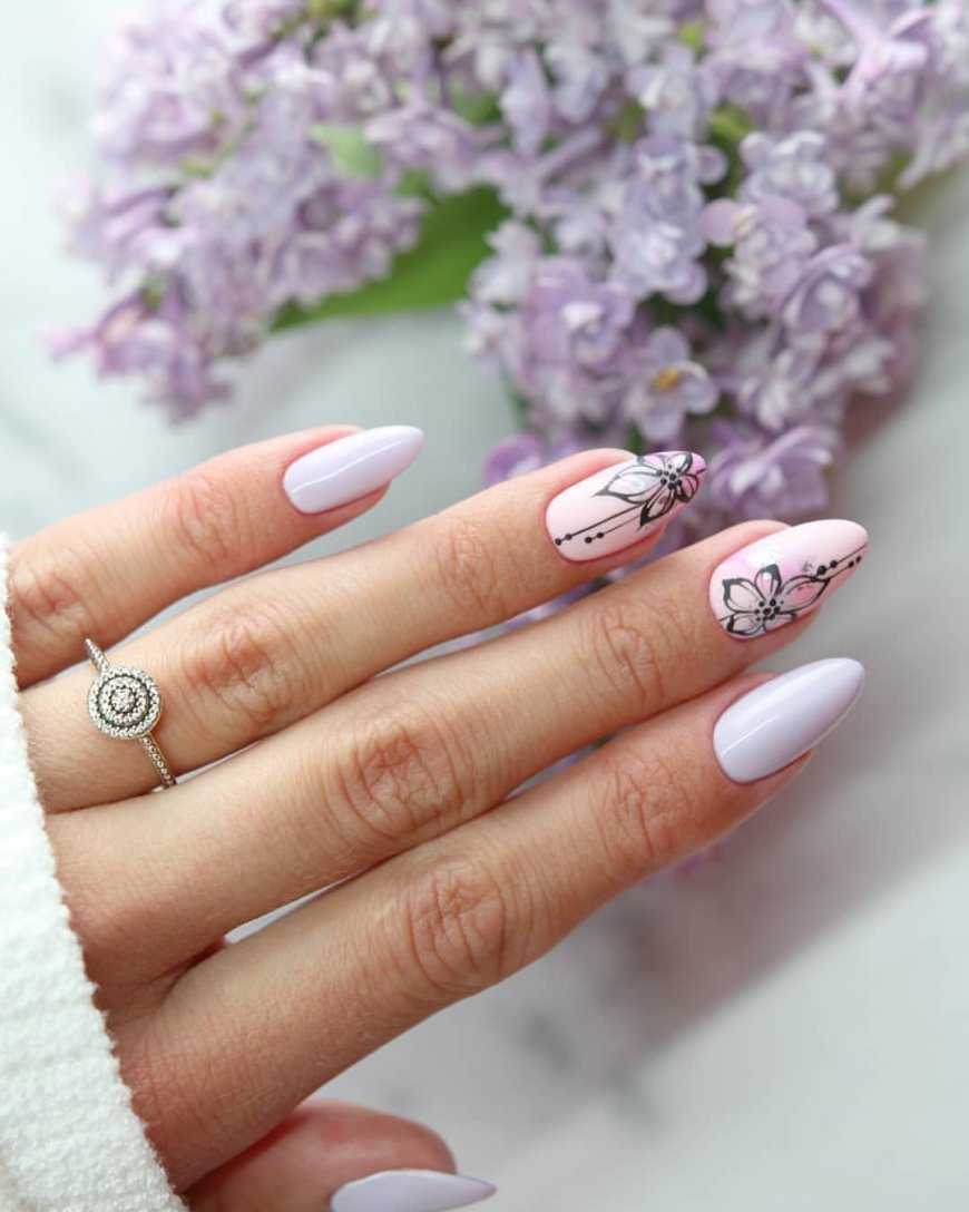 Нежный цветочный рисунок на ногтях — создаётся полное ощущение того, что рисунок выполнен на бумаге.