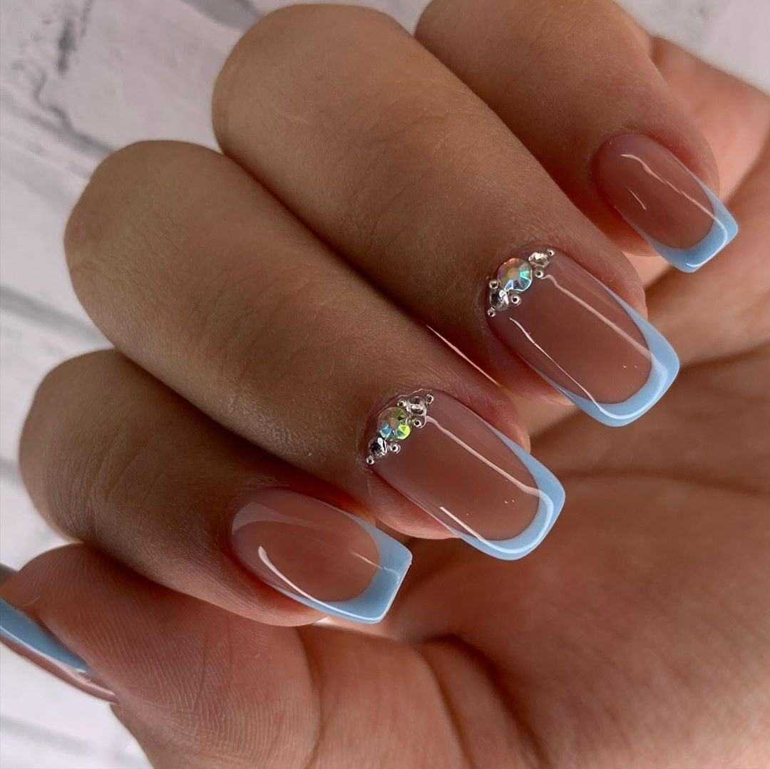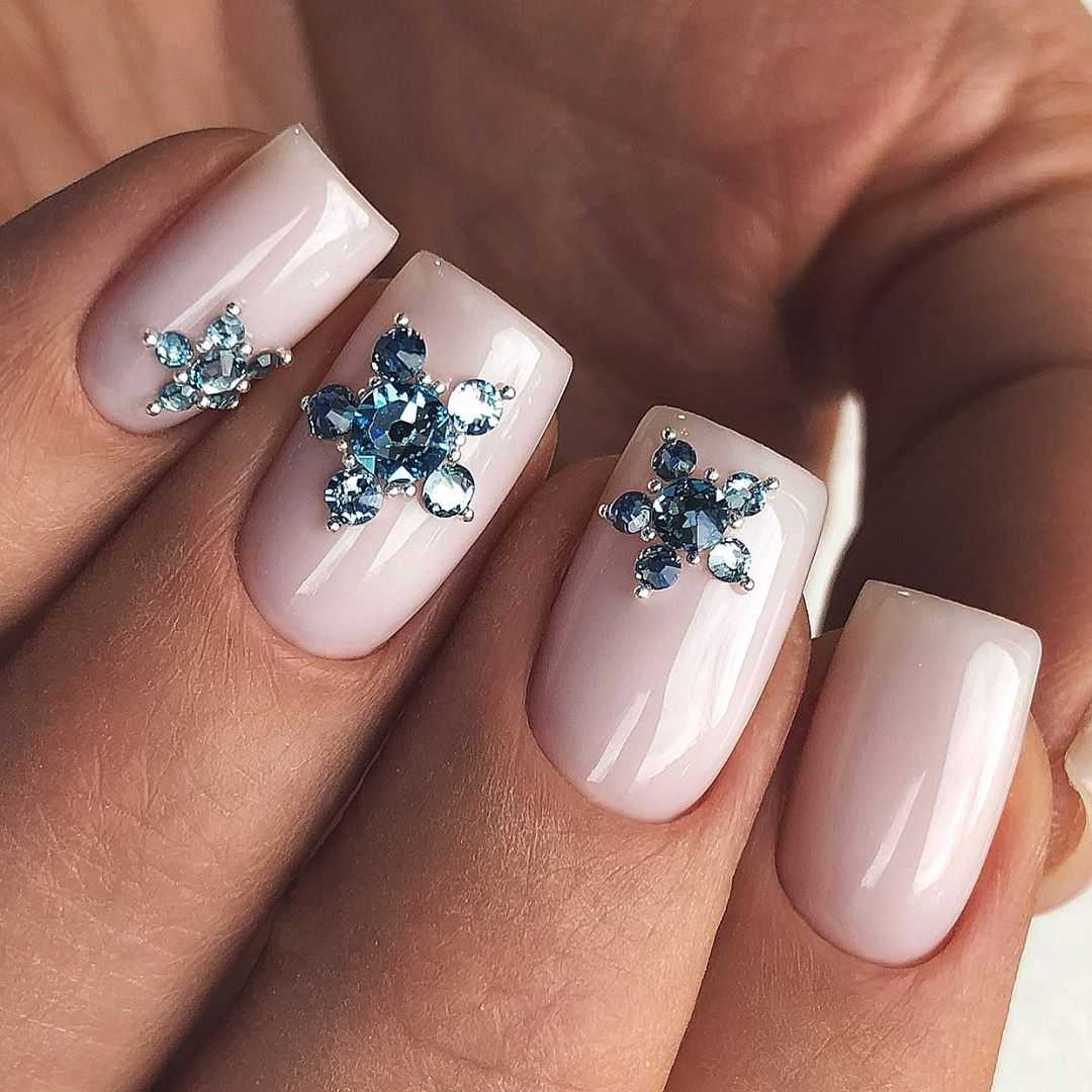 Бежевый маникюр с синим лаком отлично смотрится со стразами на длинных ногтях. Несколько ногтей делаем телесного цвета, а другие синего. Дальше клеим камушки россыпью или складываем их в линию.