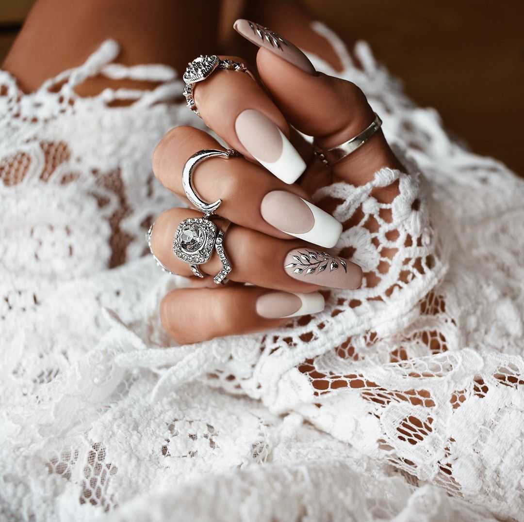 Длинные ногти дают большее пространство для фантазии и оформления ногтя. Но стоит помнить, что в тренде аккуратные ноготки практичной длины, а наращивание «по максимуму» давно не актуальны. Также на длинных ногтях стилисты не рекомендуют делать острую форму и квадрат. Для длины ногтя от 3 мм запросто можно использовать и глянцевое, и матовое бежевое покрытие. Ограничений по дизайну и декору нет.