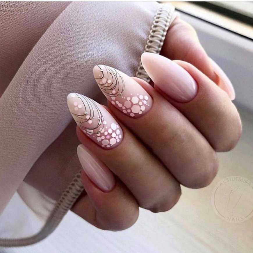 Еще одним модным вариантом блесток являются блестящие конфетти. По-другому их называют камифубуки. Их принято располагать у основания или в середине ногтевой пластины. На бежевом фоне можно использовать сразу несколько оттенков конфетти. При помощи этих декоративных элементов можно создать модный эффект градиента.
