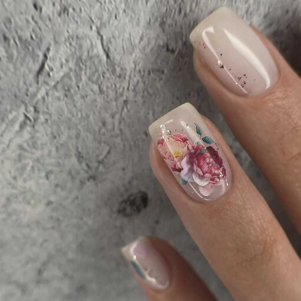 Одним из неоспоримых лидеров в дизайне бежевого маникюра, являются различные флористические мотивы на ногтях, выполненные в технике акварель, при помощи наклеек или стемпинга. Бежевый цвет уникально сочетается со многими оттенками